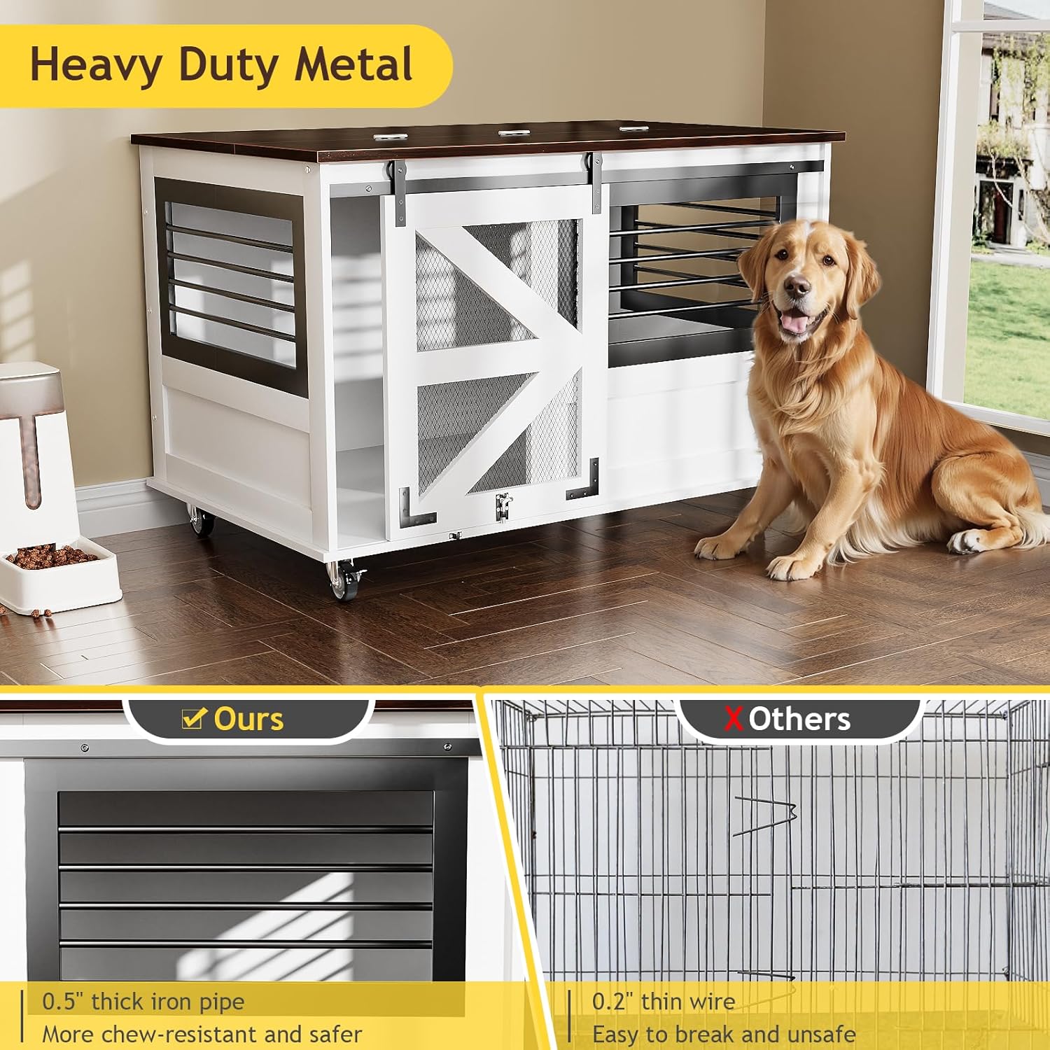 47 inch XL Dog Crate Furniture with Top-Access Teasing/Feeding Doors, Farmhouse Wooden Decorative Dog Crates with Wheels, Chew-Resistant Dog Crates End Table for Medium&Large Dogs, White