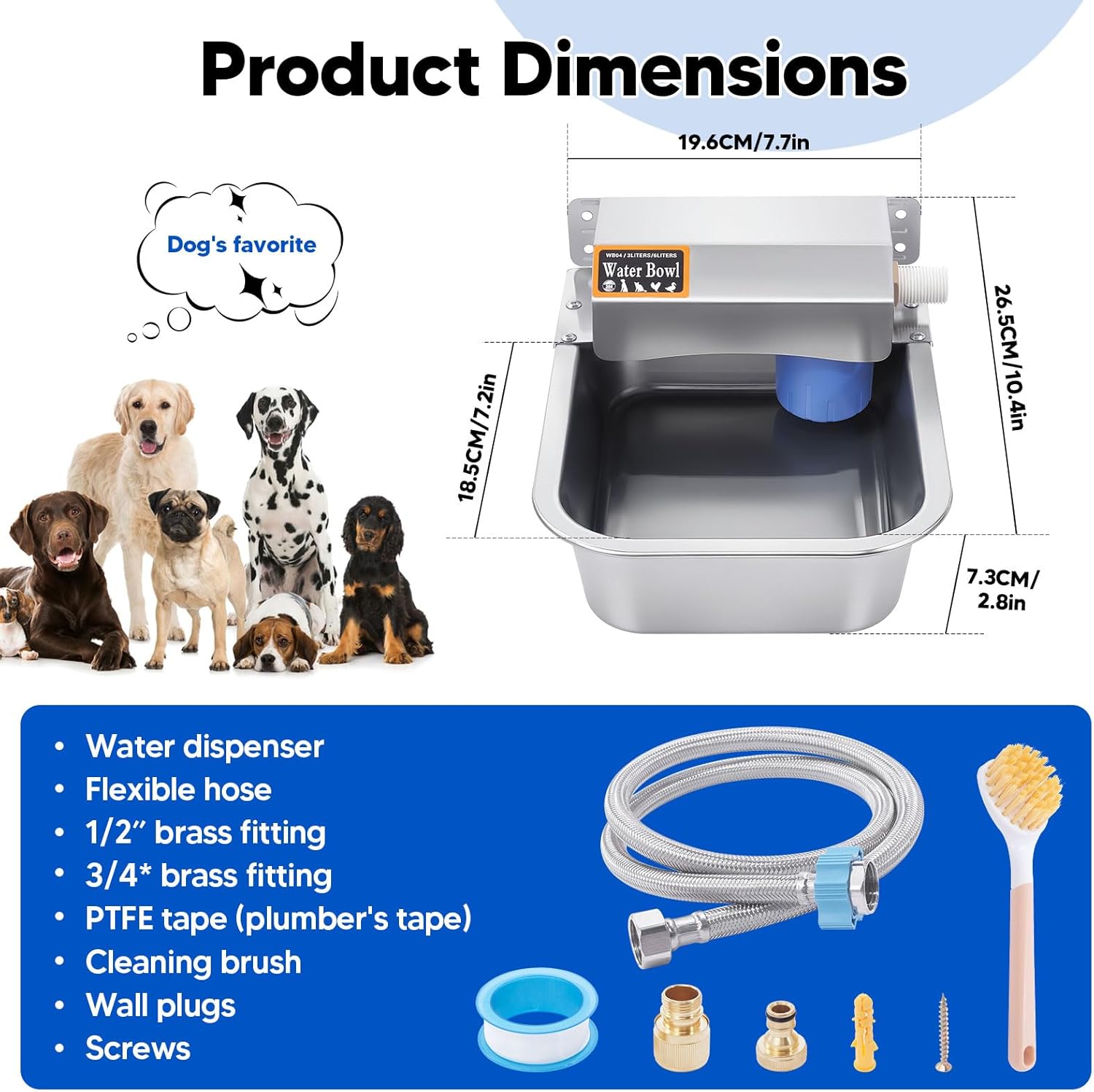 • EASY TO INSTALL:The dog water bowl dispenser comes with a complete set of accessories such as brushes, expansion screws, copper connectors, and detailed instructions. The copper fitting is suitable for connecting 3/4 inch faucets and is easy to install. Tips: If you encounter any obstacles during installation, please feel free to contact us and we will assist you to solve the problem