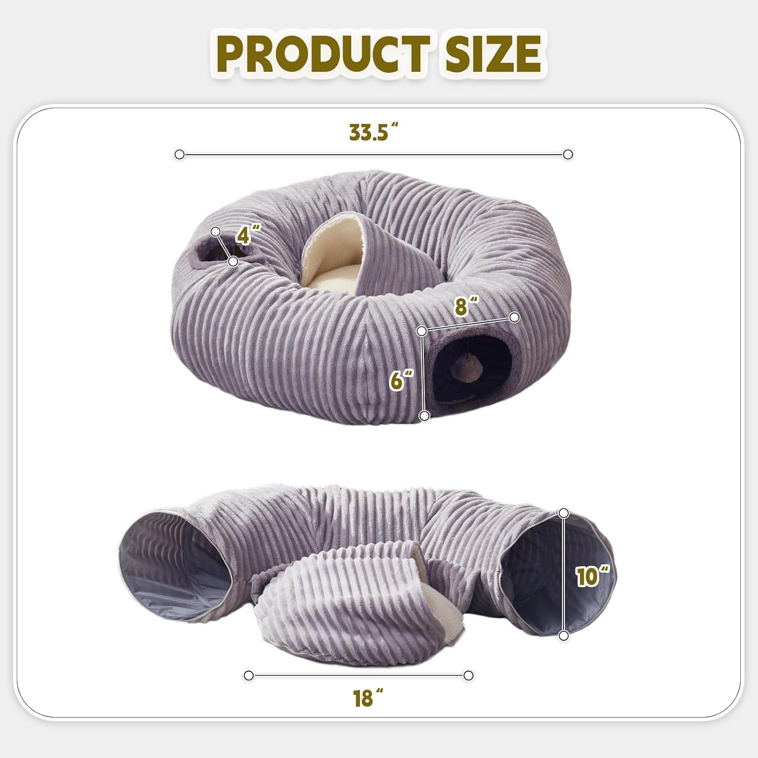 • Multiple Shape Combinations - Zipper separation design can be shaped into circular, S-shaped, semi-circle or any other shape you like. 3 peek holes design is perfect setup for multiple cats played.Come and play hide and seek with your cat!