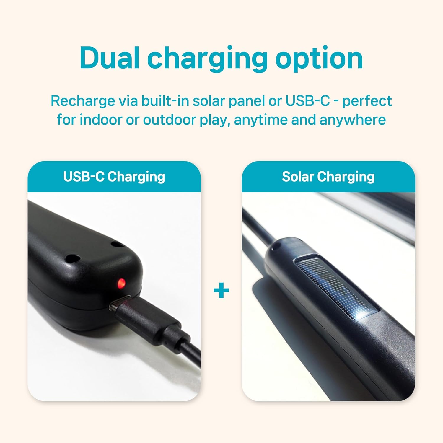 • 【Dual charging option】 Recharge via built-in solar panel or USB-C - perfect for indoor or outdoor play, anytime and anywhere.