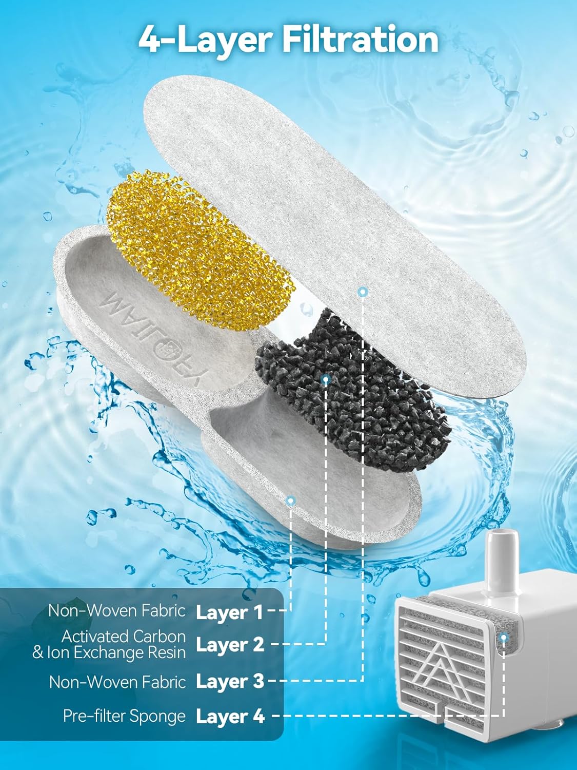 • 4-Layer Filtration System: The fountain features a 4-layer filtration system that includes activated carbon, ion exchange resin, non-woven fabric, and a high-density pump sponge, which ensures that every slip is fresh water.