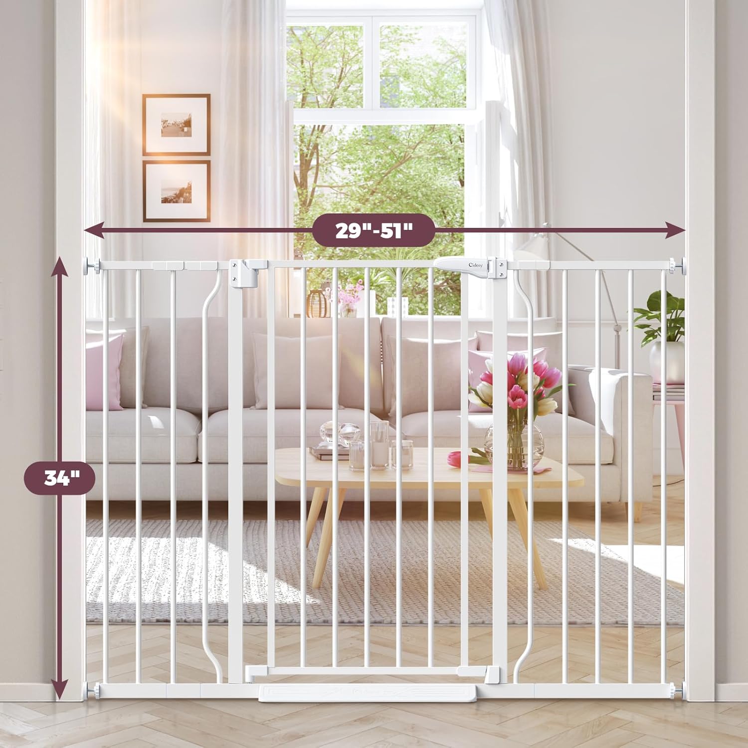 • Extra Tall & Extra Wide: This baby gate expands from 29" to 51" wide, creating secure barriers for oversized doorways, staircases, hallways, and other off-limit areas. It stands 34 inches tall, making it ideal for both curious toddlers and large pets