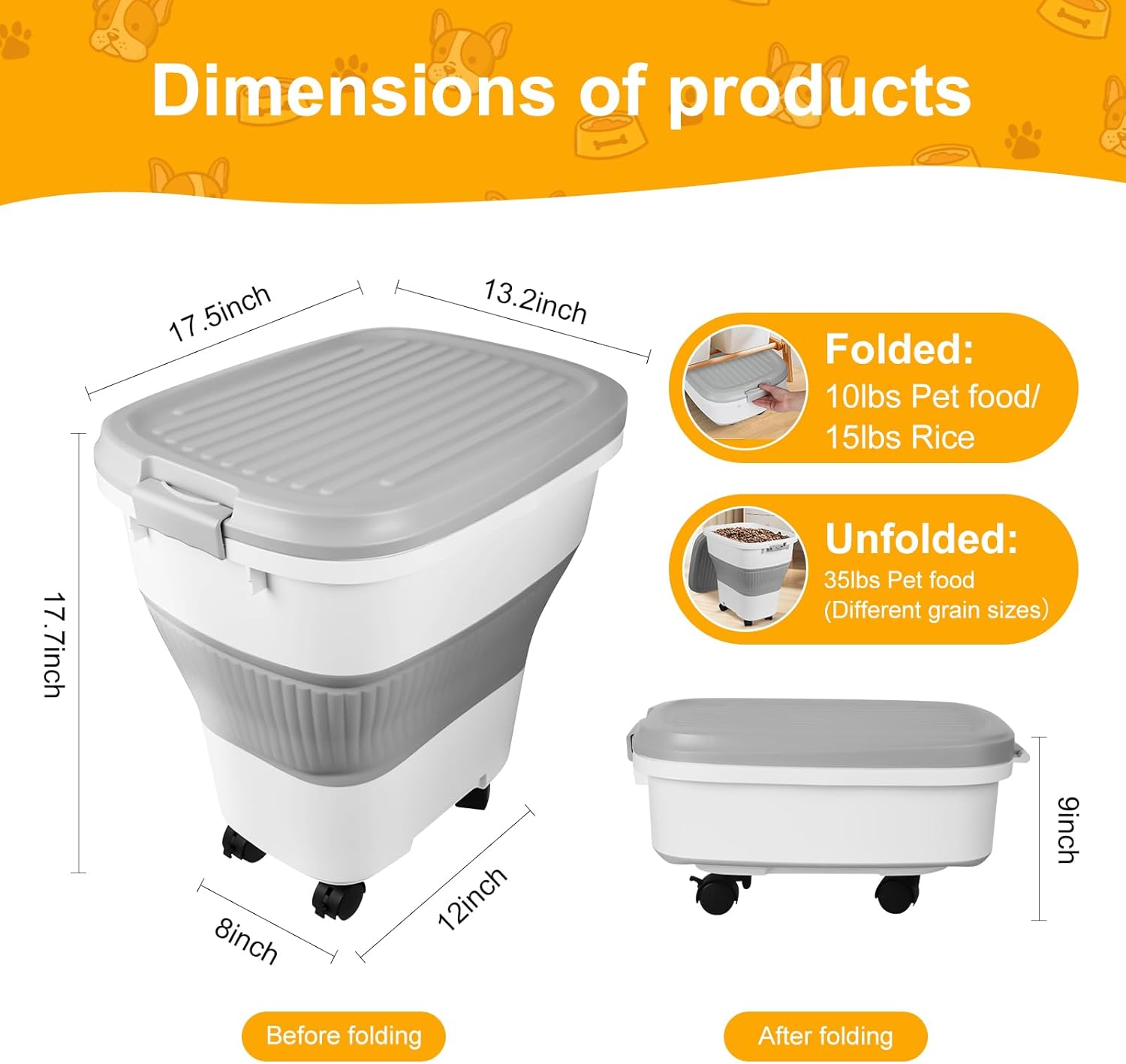 • FLEXIBLE FOLDING DESIGN: Unfolded size 17.7 x 17.5 x 13.2inches, can store 35 lbs of dog food or 60 lbs of rice, storage varies by food particle size