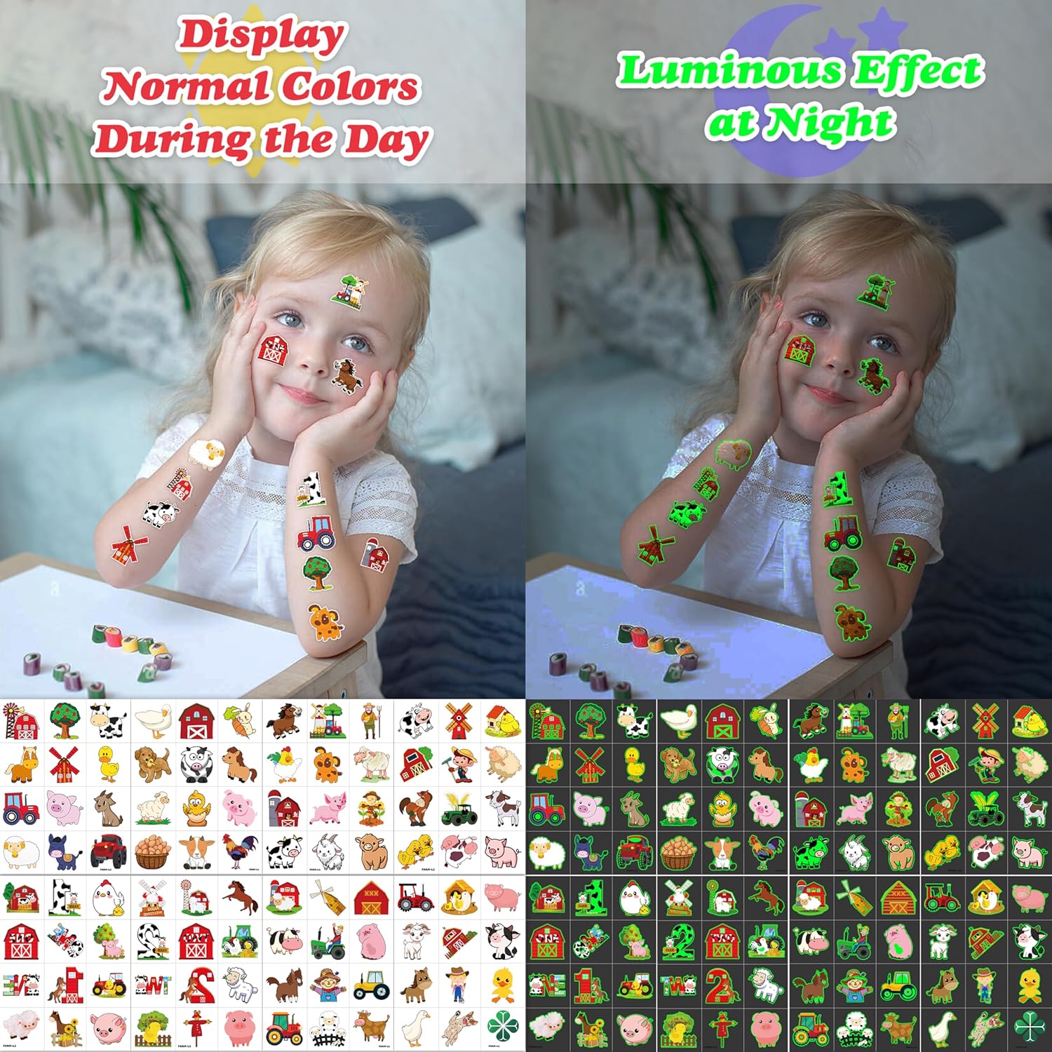 • 🐄TATTOOS FOR FARM BARNYARD ANIMAL THEMED DECORATION: FARM GLOW IN THE DARK DIE-CUT TATTOOS for people who love farm, farmhouse , Animal. Featuring 8 sheets with 96 pcs of lovely, fun and colorful design: Cow, pig, horse, tractor... Each sheet measures 6.3 * 4.7 inches. You can temporarily tattoo them on your body or objects such as phones, bottles, laptop…