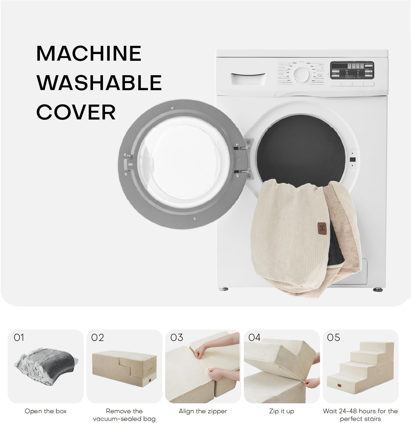 • 【Easy to Clean】: The dog stairs feature a removable, machine washable cover for effortless cleaning. Simply take out the foam core for washing; however, please avoid cleaning the foam and board. After removing from the compression bag, allow 24-48 hours for the foam to fully expand before use for optimal comfort