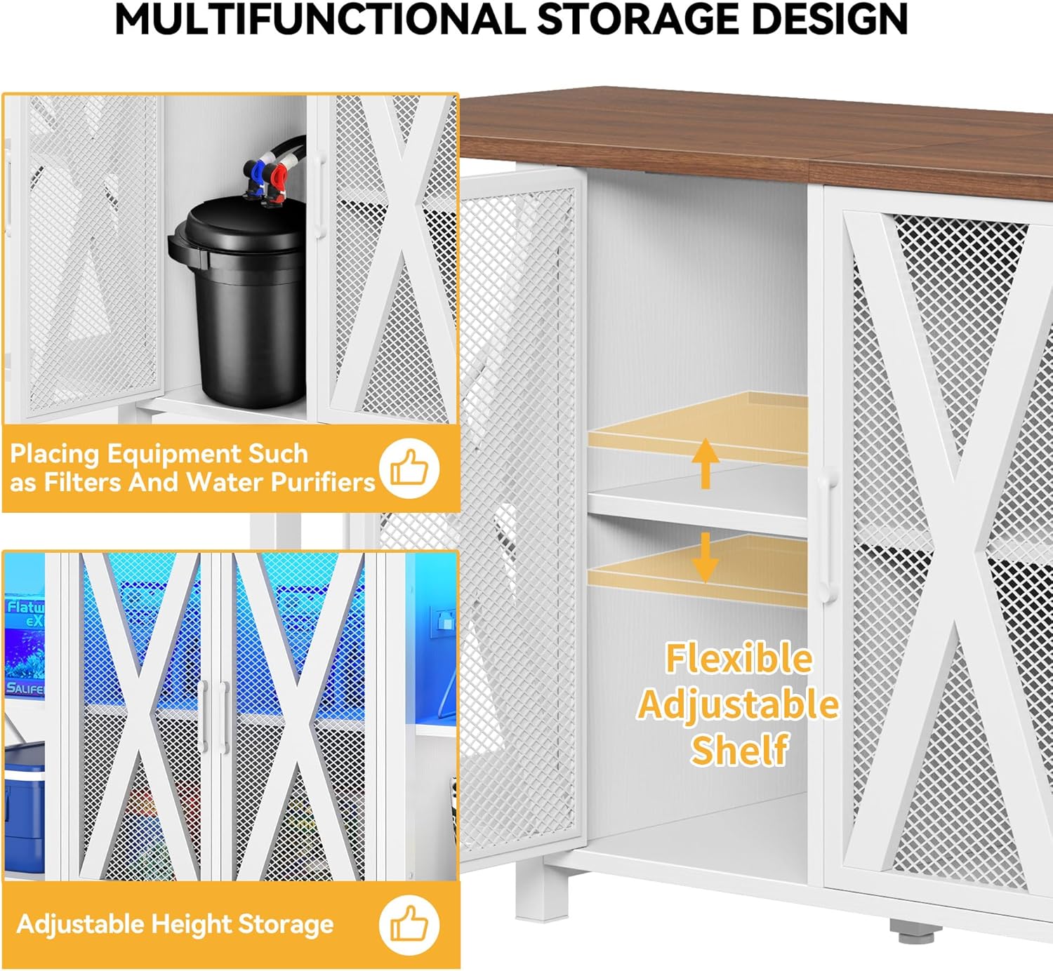 • Gorgeous LED Lights: Our aquarium stand is equipped with LED lights featuring RGB capabilities, both on the cabinet and above the smaller fish tank stand. This allows you to adjust the lighting of your aquarium according to your mood, creating any desired illumination