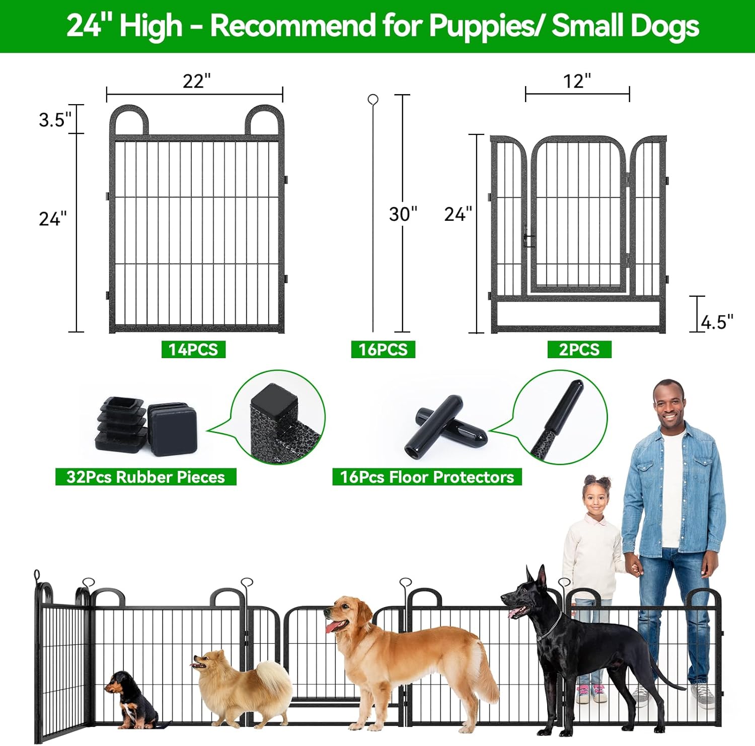 Puppy Playpen 16 Panels Small Dog Fence Outdoor Indoor Use 24" Height Anti-Rust with Doors Portable Dog Play Pen for RV Camping Yard, Total 29FT, 68 Sq.ft, Snowy Black