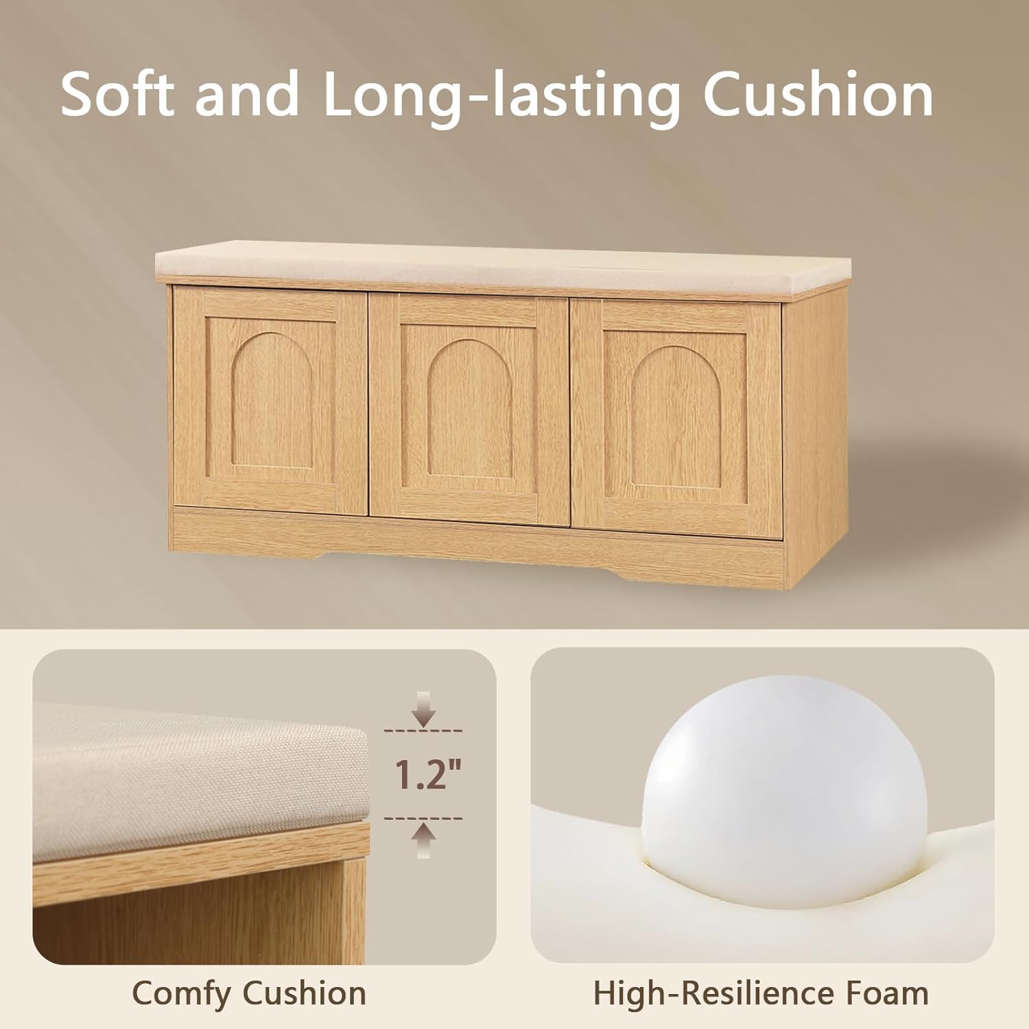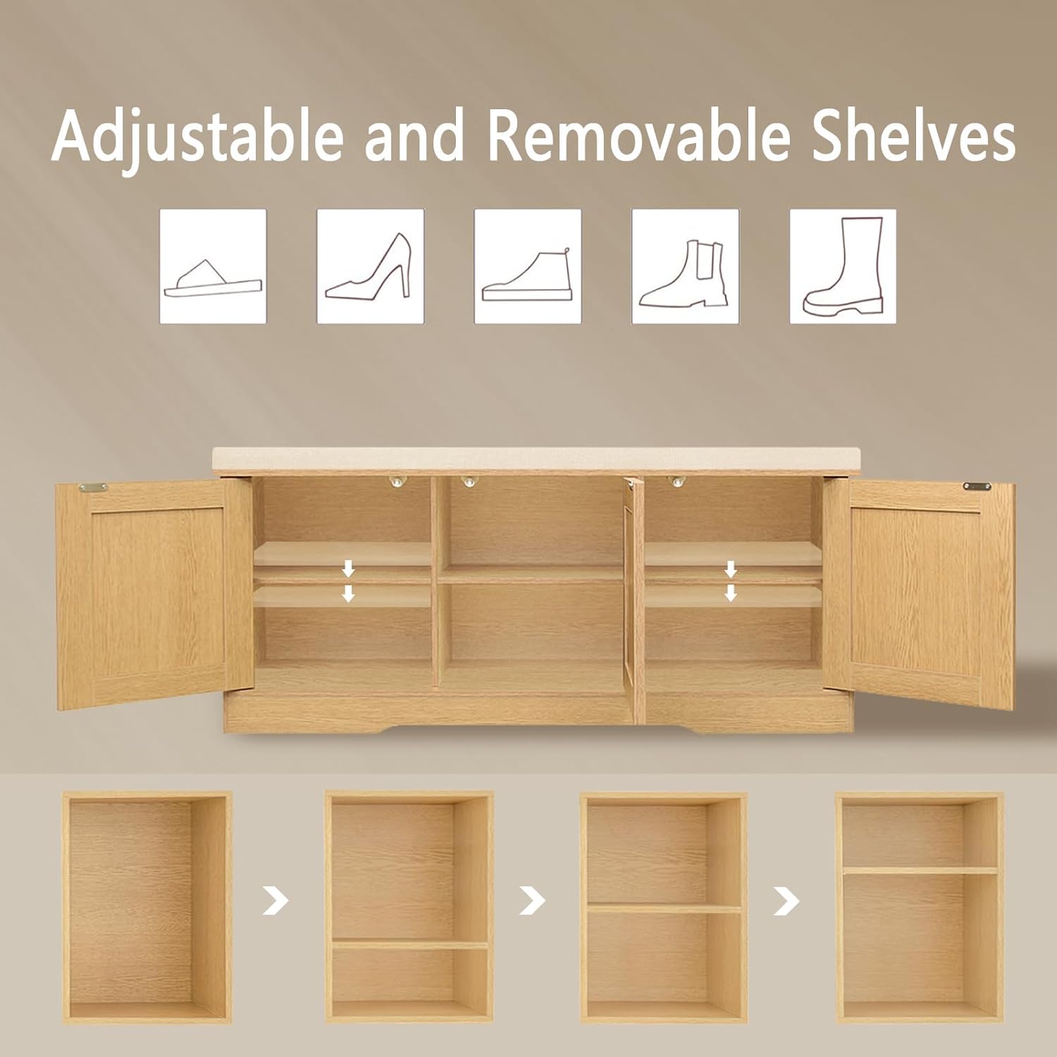 DINZI LVJ Shoe Bench, Entryway Storage Bench with Doors, Cushion, 2-Tier Shoe Rack with 6-Cubby, 39.4”L x 13.8”W Shoe Organizer Cabinet, Adjustable Shelf, Living Room, Bedroom, Natural