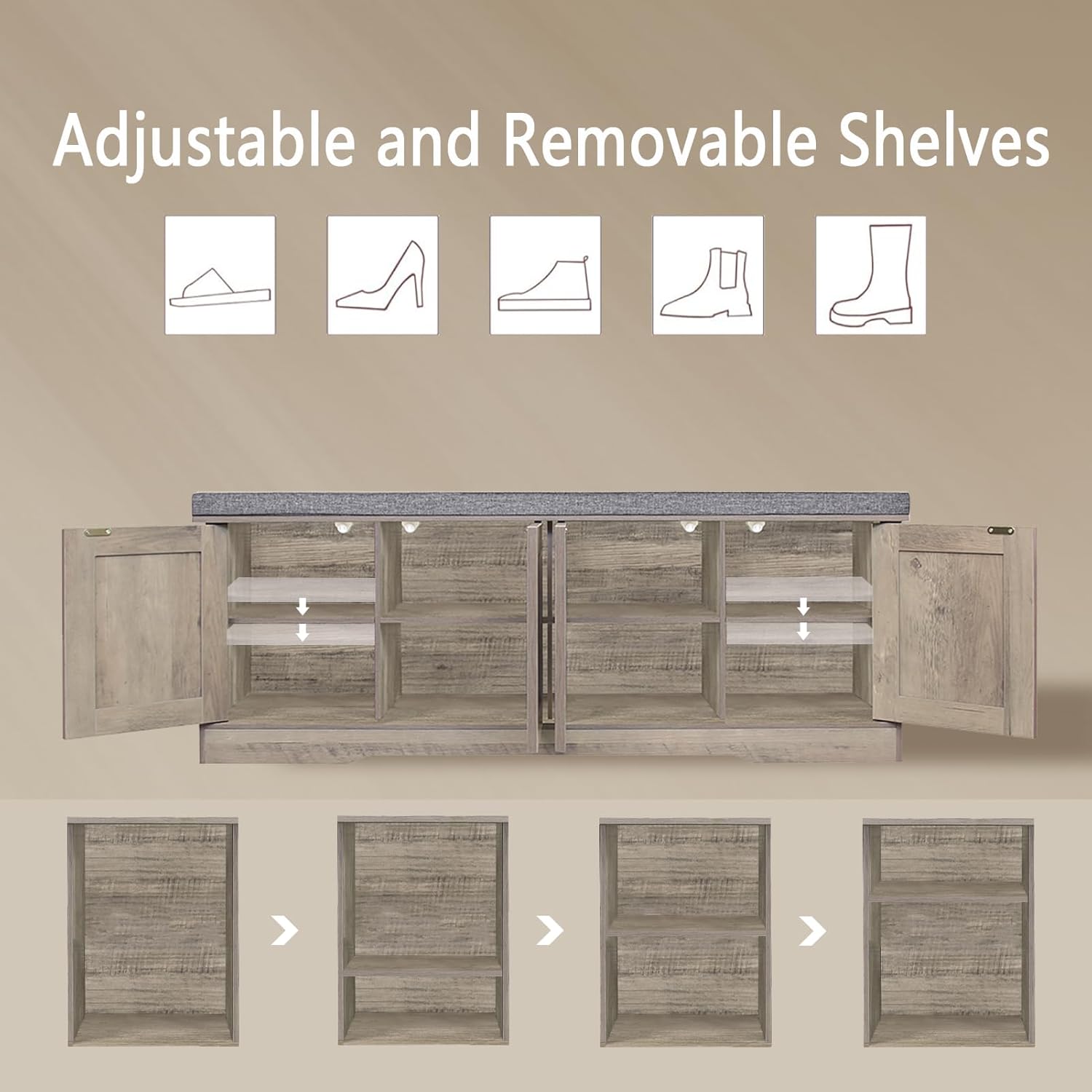 • 【Flexible for Multiple Needs】4 middle compartments are fixed for sneakers, high heels and sandals. The side compartments have 3 adjustable heights for slippers, tall boots or storage boxes. Use as an entryway bench, window seat or bedside bench to store blankets, books and toys in the living room and bedroom