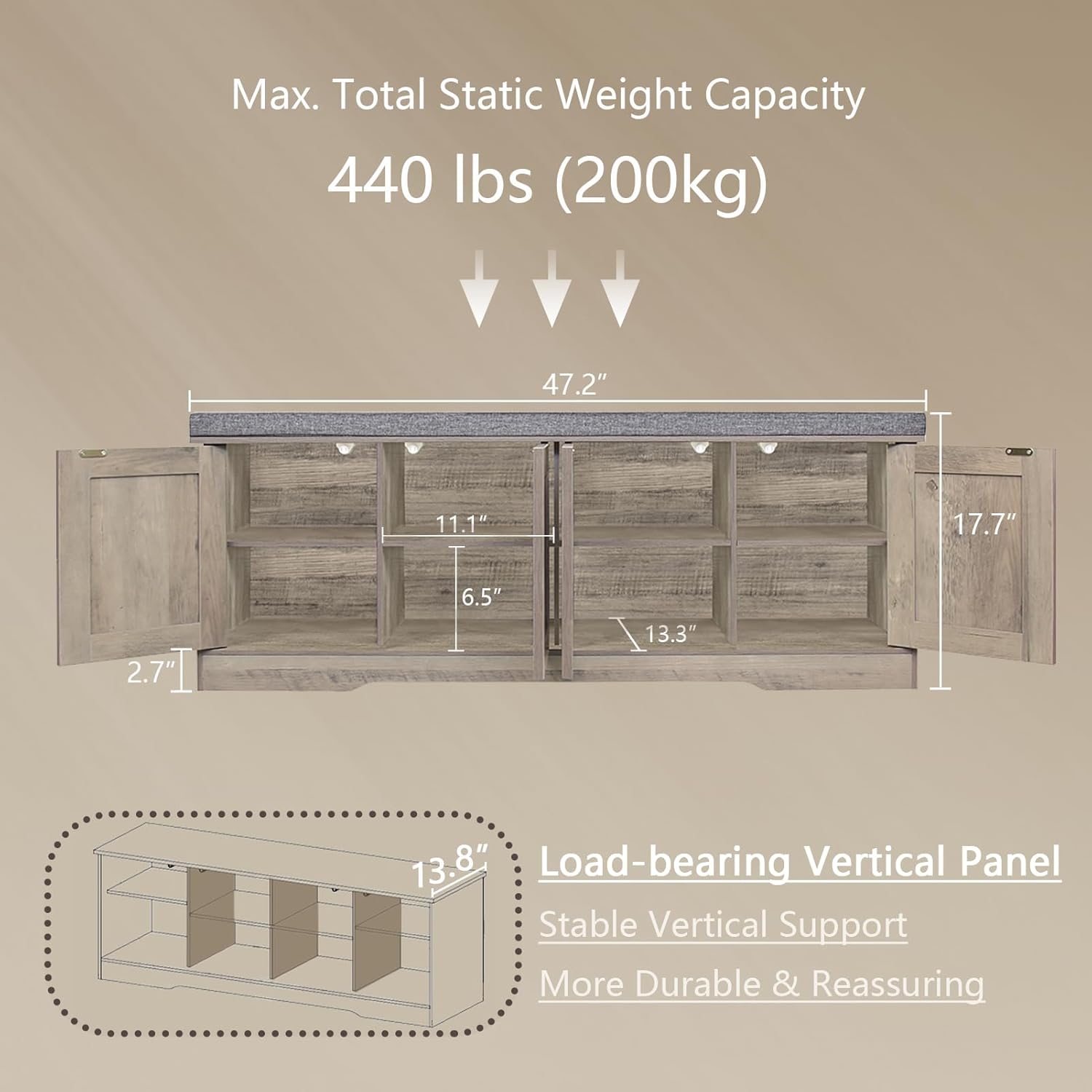 • 【Stable & Long-lasting】The shoe rack bench is made of high quality particle board. Durable compartments design provides extra vertical support, enabling it to bear a load up to 440lbs (200kg). Its removable padded design can help you remove and clean cover easily. Dimension: 47.2”L x 13.8”W x 17.7”H