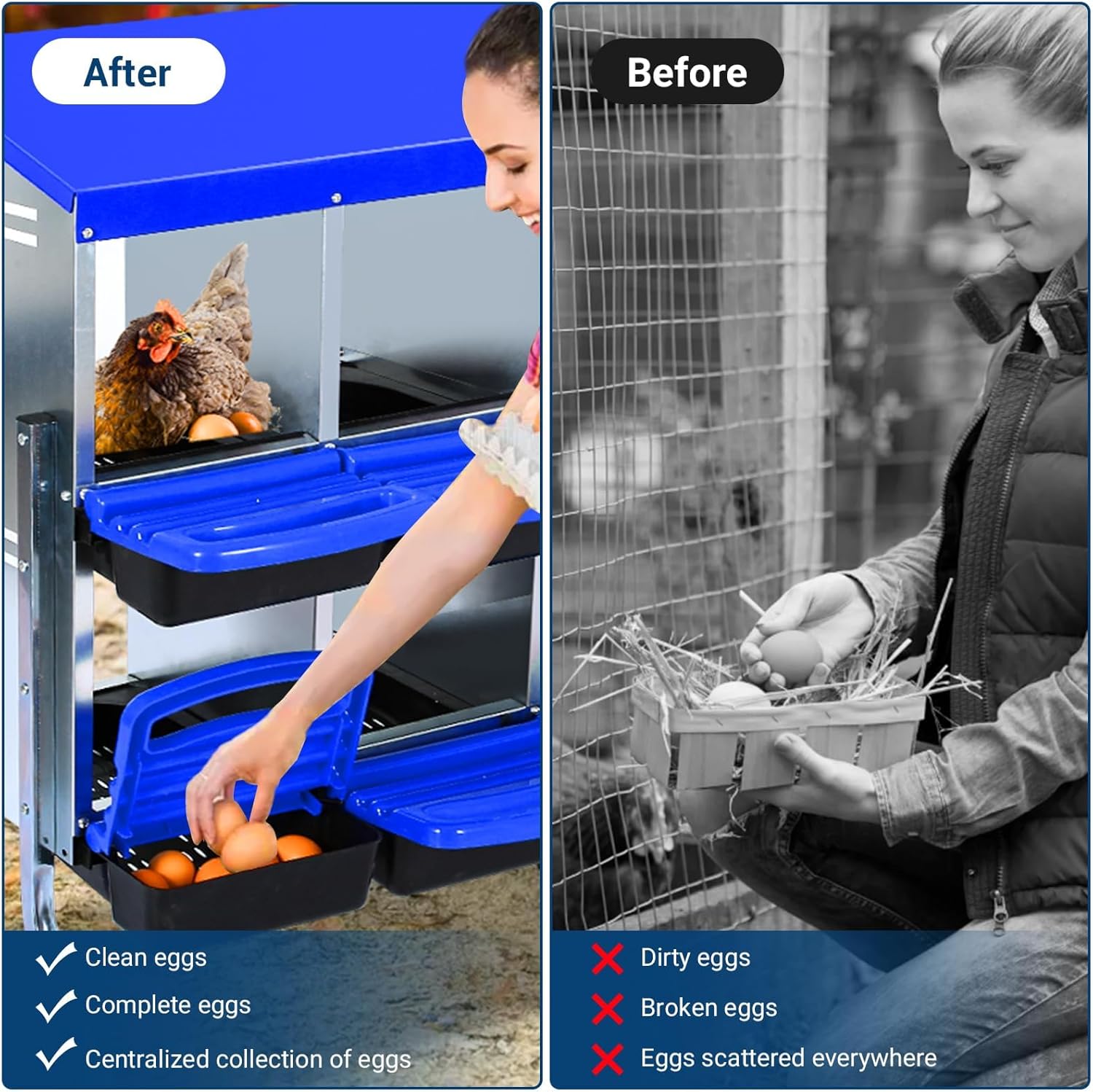 • EFFICIENT EGG COLLECTION SYSTEM: Featuring a gentle incline, our innovative design allows eggs to roll into a conveniently accessible tray. This eliminates the need to reach into the nesting area, streamlining your egg collection routine and ensuring a clean, hassle-free harvesting experience.