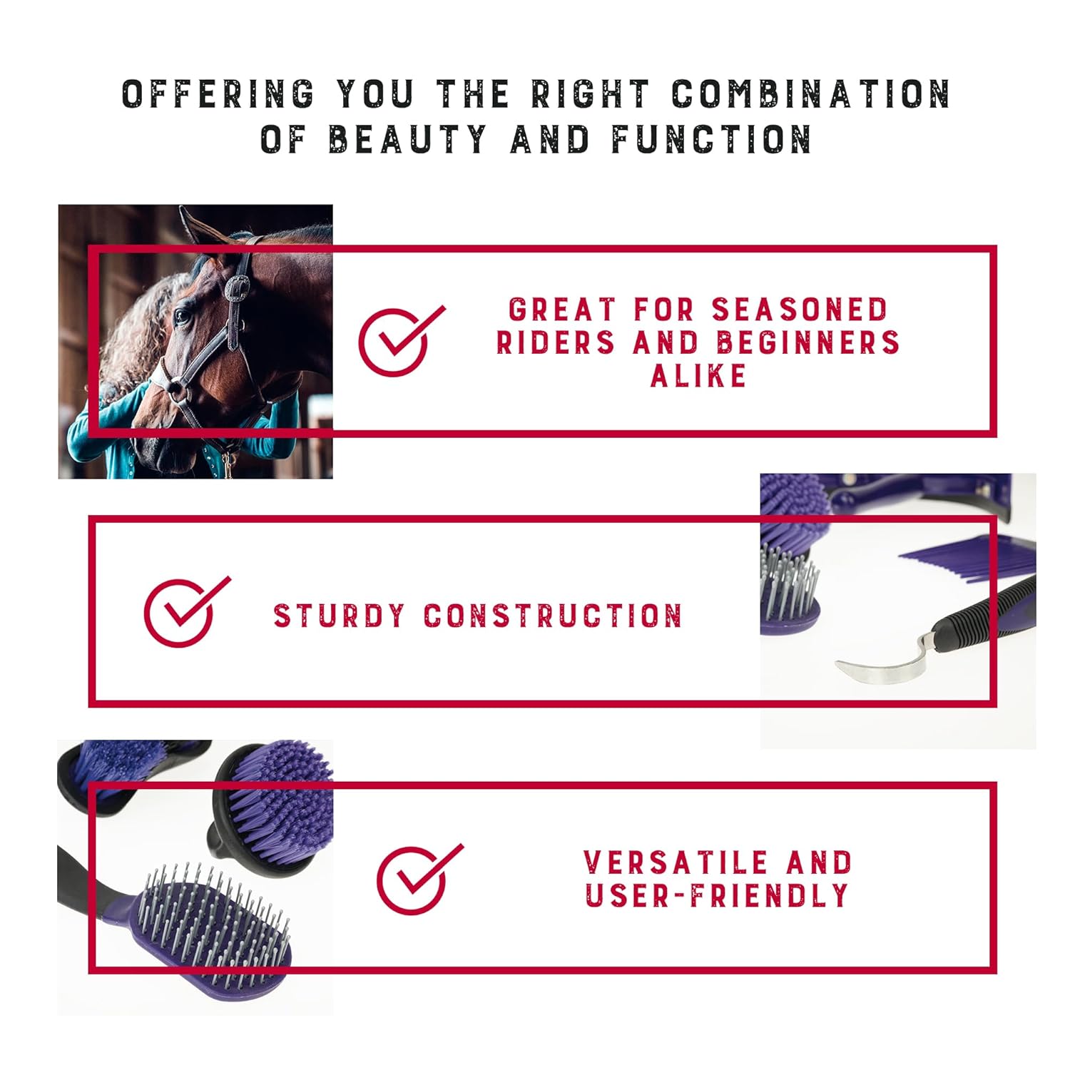 • Horse Grooming Kit: Ensure effortless cleaning and grooming of your horses with our horse grooming set; these 6-piece horse essentials include a comb, hoof pick, palm-held brush, mane and tail brush, dandy brush, and sweat scraper/coarse curry combo
