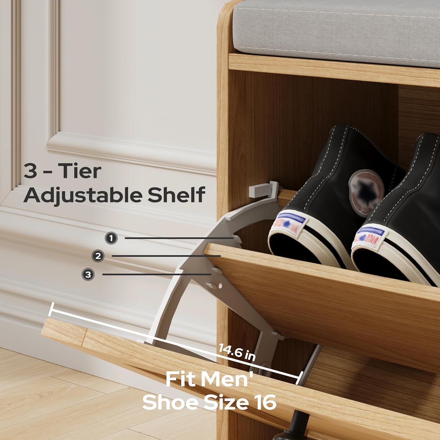 • Flexible Shoe Storage Space: With an adjustable and removable shelf in the drawers, this entry bench allows you to customize the space for different types of footwear. Whether itโ€™s slippers or sneakers, our farmhouse shoe bench ensures that all your favorite shoes have a dedicated home