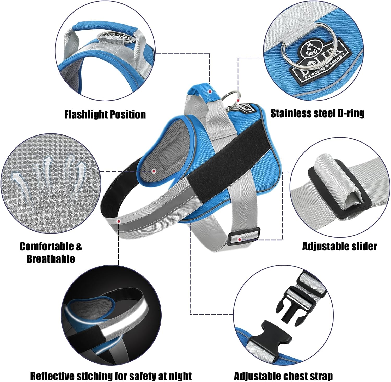 • OUTDOOR HEALTHY: Puppy no pull dog harness with reflective straps to ensure your dog is highly visible and keep dogs safe at night. You can connect the dog leash on the D-ring and with handle is easy to control on crowded streets. The high-end pet harness is perfect for daily walking, running, hiking, training, hunting, outdoor adventure and more!
