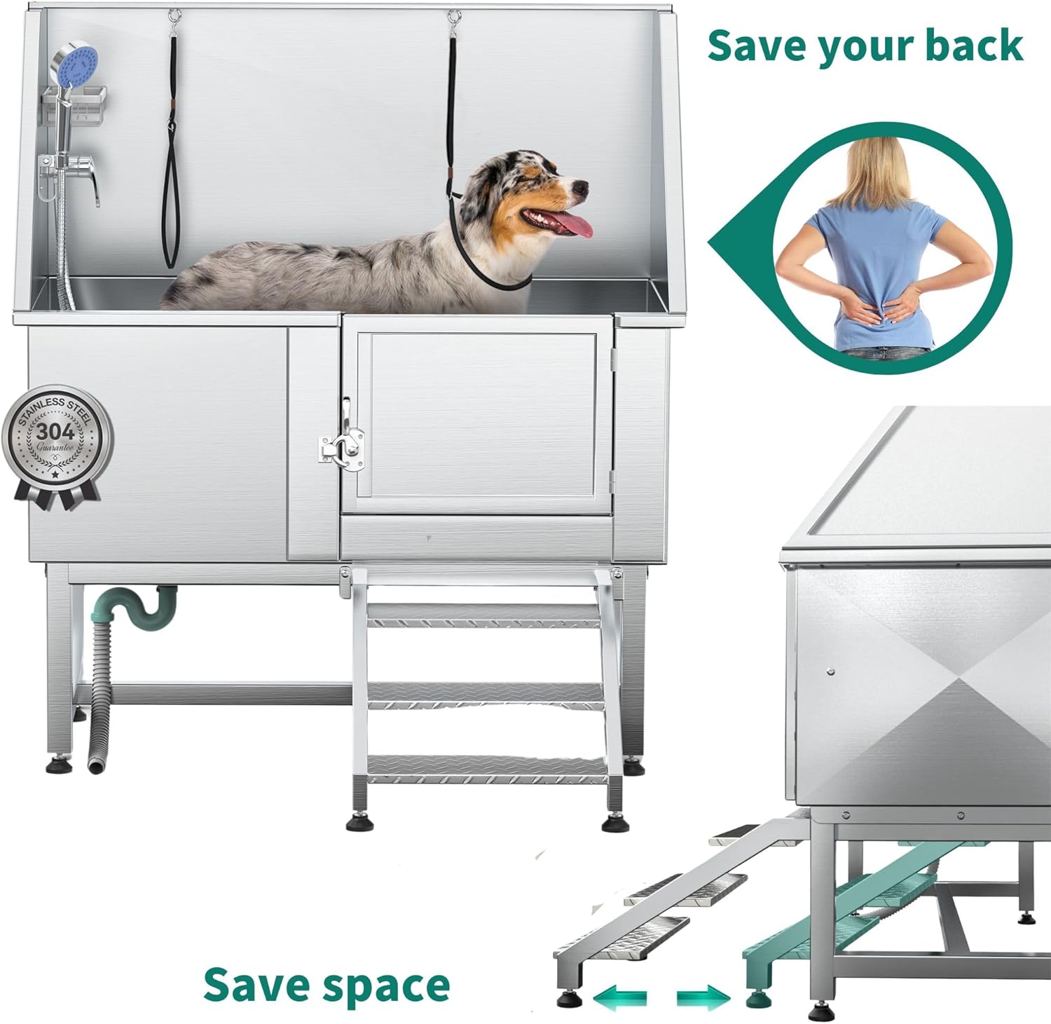 • Durable Construction: The body of the pet bathtub is Made from 304 stainless steel with a 330 lbs load capacity, ensuring resistance to deformation and rust for long-lasting durability and easy maintenance