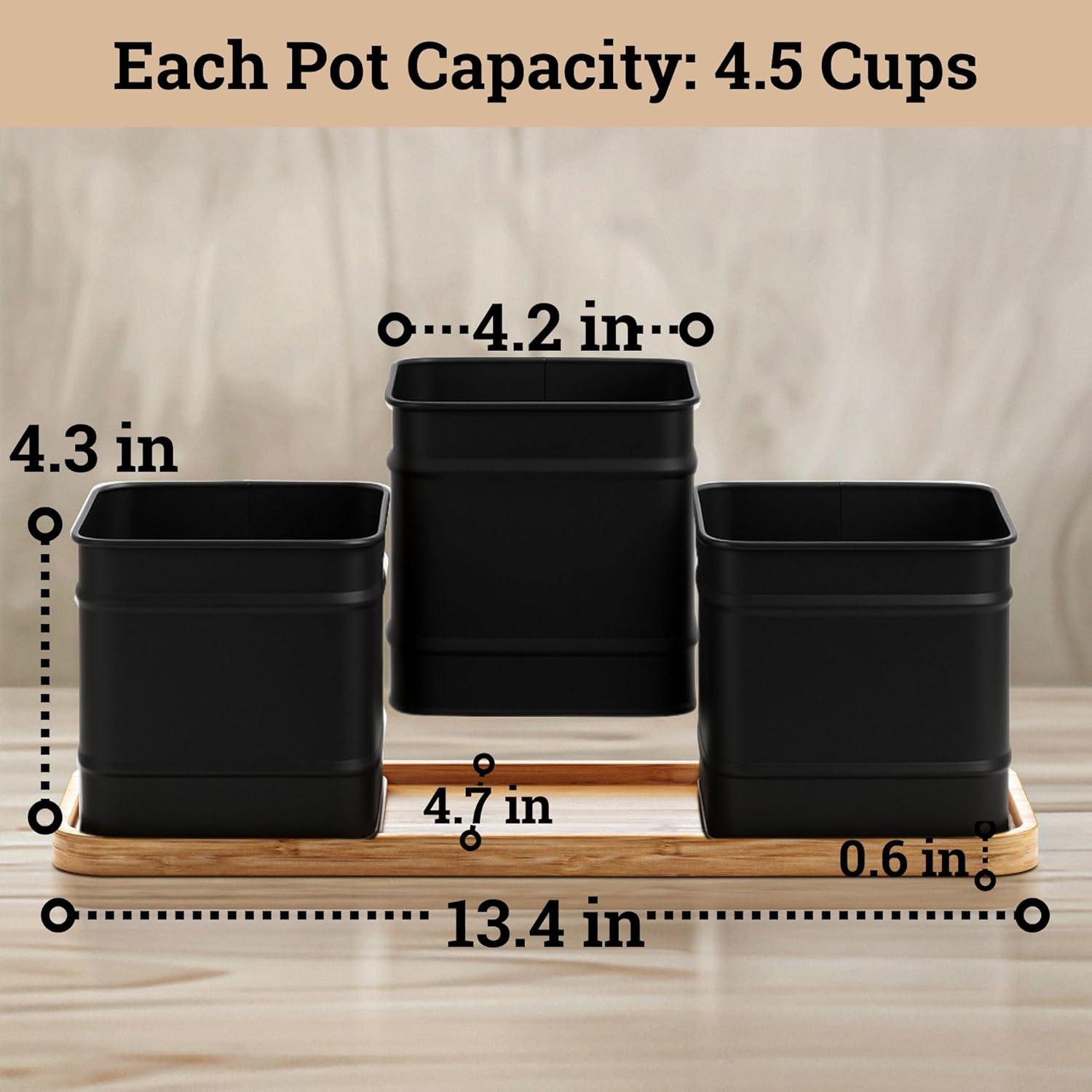 Herb Planter Indoor - 3 Iron Herb Pots with Drainage Holes, Varnished Bamboo Tray, Customizable Labels & Marker Pen - Indoor Herb Garden Planter - 3 Pots for Herbs - Inside Spice Garden - Basil Pot