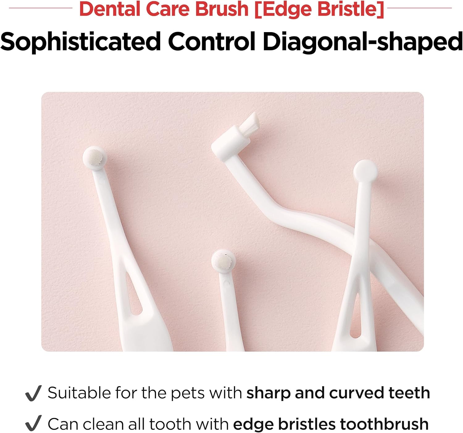 • Sophisticated Control - Our ergonomic fit horizontal toothbrush is suitable for petโ€™s sharp & curved teeth. The diagonal shape of the bristle minimizes possible damage to the gum.