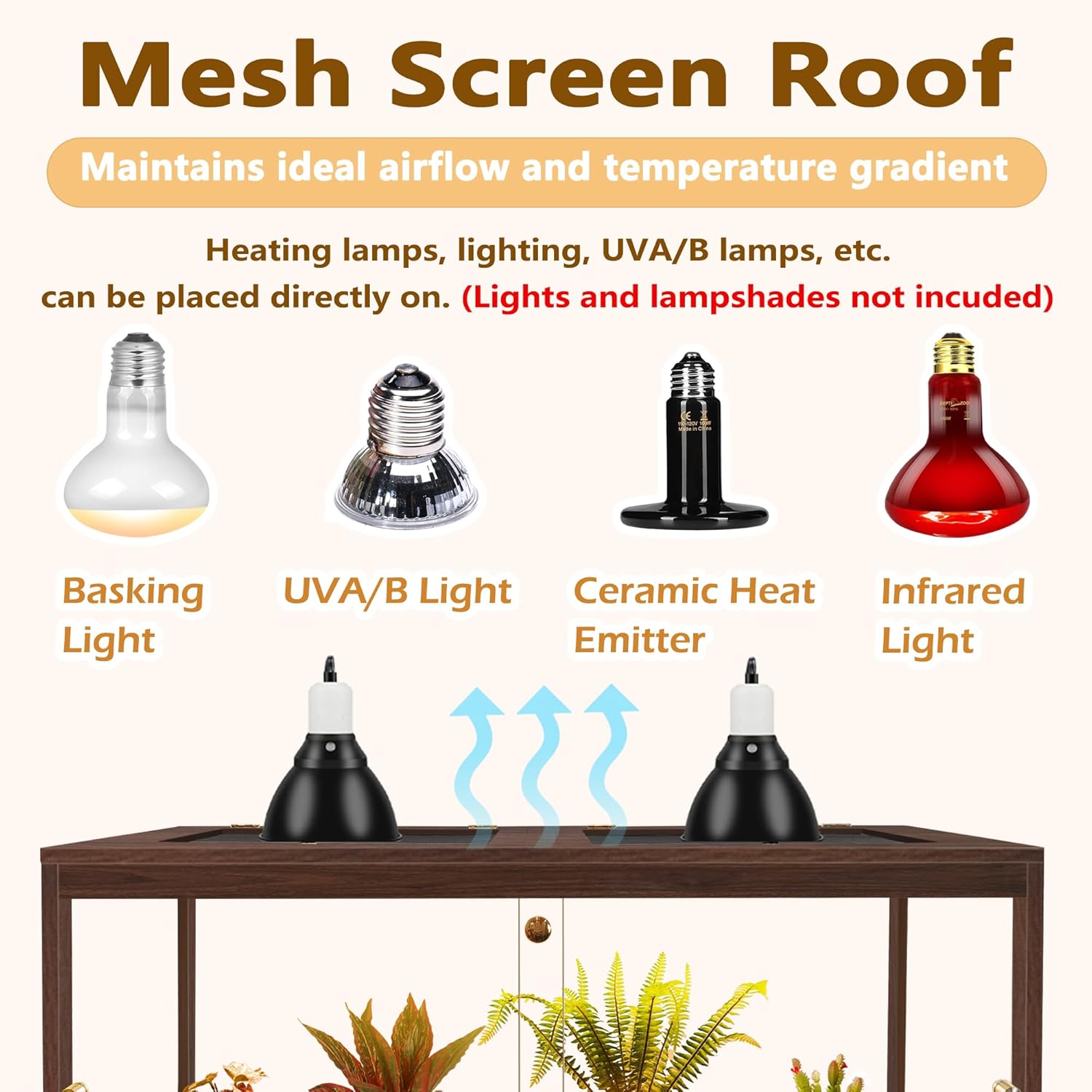• 【Functional Elegance】Designed with functionality in mind, our reptile terrarium features double sliding front doors that can be effortlessly opened or secured with a lock to prevent escape attempts. The top is fitted with sturdy metal mesh, allowing for proper ventilation and accommodating the direct placement of heat lamps and UVA/B lights (not included) to ensure optimal temperature regulation.
