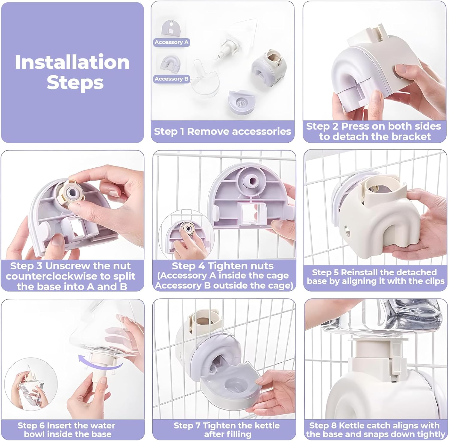 • Adjustable Height & Anti-Tip Hanging: Small animal water bottle secure knob-mounted hanger allows custom spout positioning to prevent neck strain, plus stabilizes the bottle against pet nudges