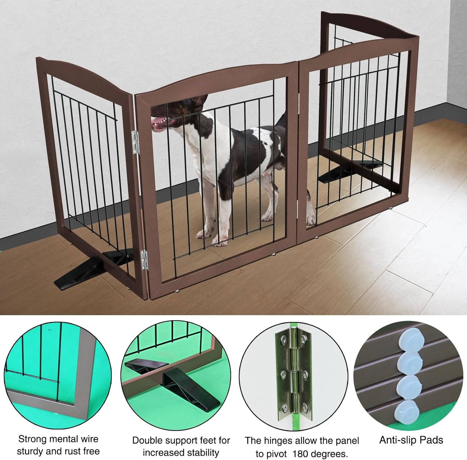 • 【Simple and Firm】This convertible wooden dog gate is a pet fence, room divider, and pet pen all in one. It combines wood and electroplated steel bars. Equipped with non - slip rubber feet, it protects your floor.