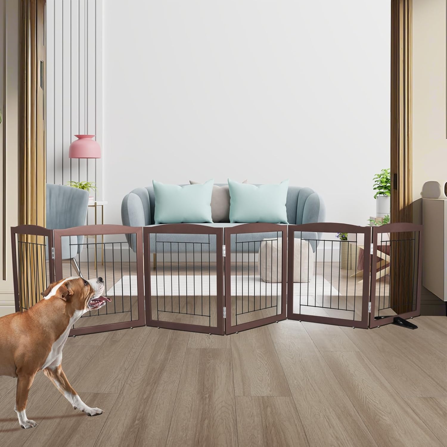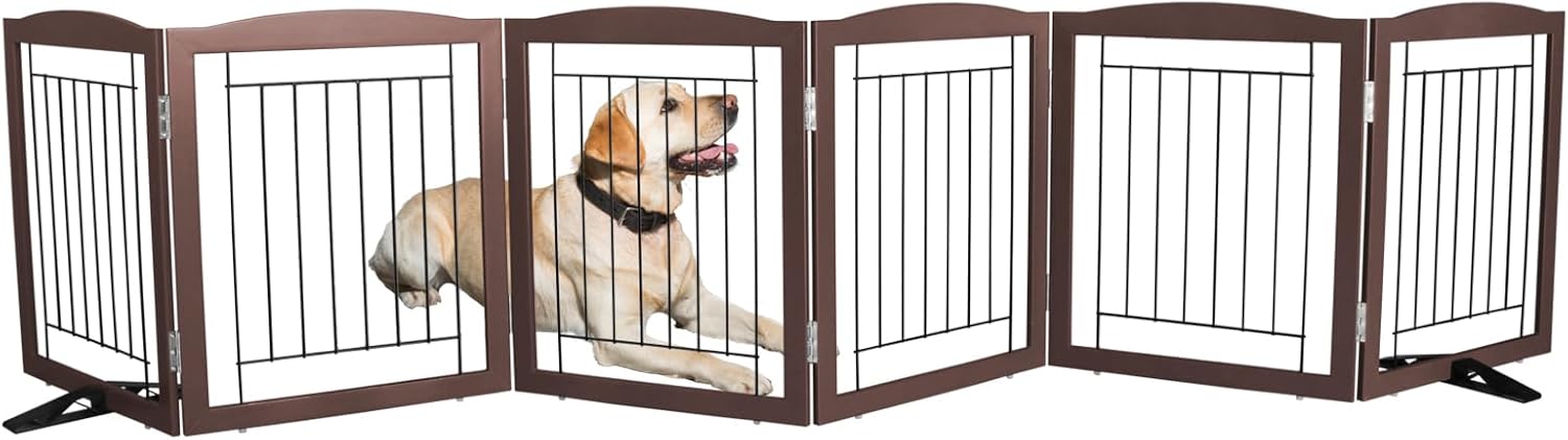 ZJSF Freestanding Dog Fence Indoor, Foldable Dog Gate for Doorways, Stairs or Hallways, Sturdy Wood Extra Wide Pet Gate with Support Feet for The House, Brown, 24 "Height-6 Panels