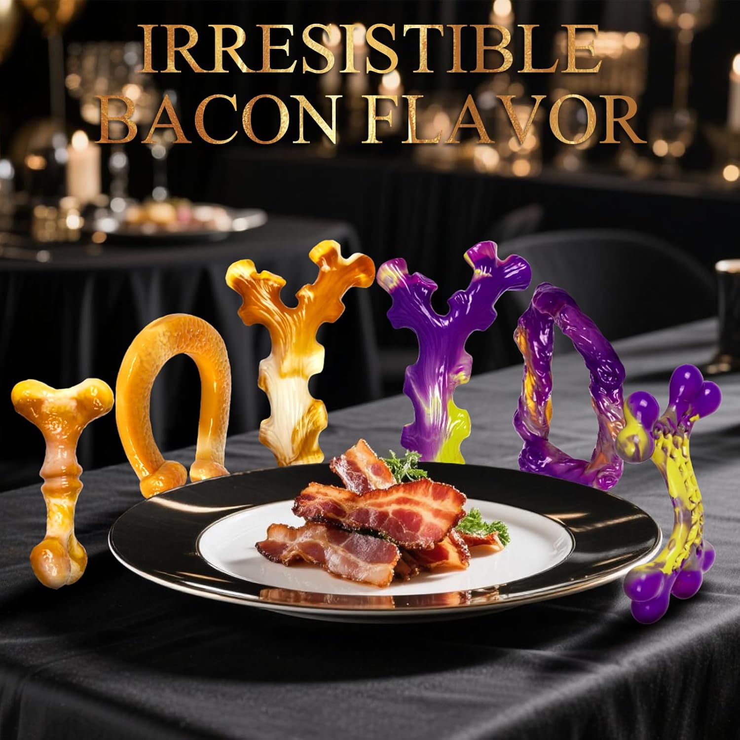 • AUTHENTIC BACON ESSENCE · IRRESISTIBLE BY DESIGN Our 6-pack features real bacon-infused nylon, specially crafted for large breeds. Watch as the savory aroma captivates your pup’s senses, transforming idle energy into focused play.