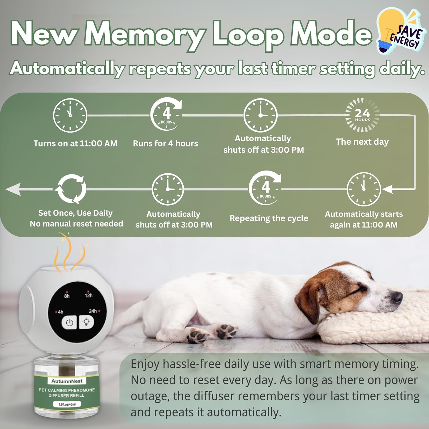 • 【Smart 4-Level Timer Design – No More Repeated Plugging】 This upgraded dog calming diffuser for dogs features 4 intelligent timing modes: 4H / 8H / 12H / 24H. Easily adjust with one button. Automatically shuts off when time is up, no need to unplug. Keeps your home calm on your schedule.
