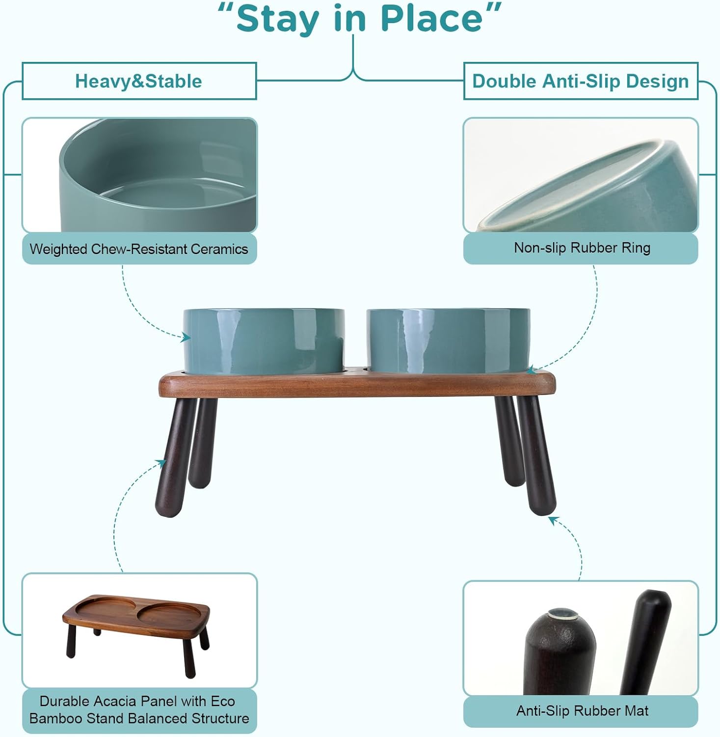 - Stable, Tip‑Resistant Design – A solid acacia wooden panel eco bamboo legs stand with Chew‑Resistant Heavyweight Ceramic, wide stance, and slip‑proof silicone pads join forces to create raised dog bowls that STAY IN PLACE on tile, wood, or laminate. Fewer spills mean cleaner floors and no accidental gouges or scratches or noisy