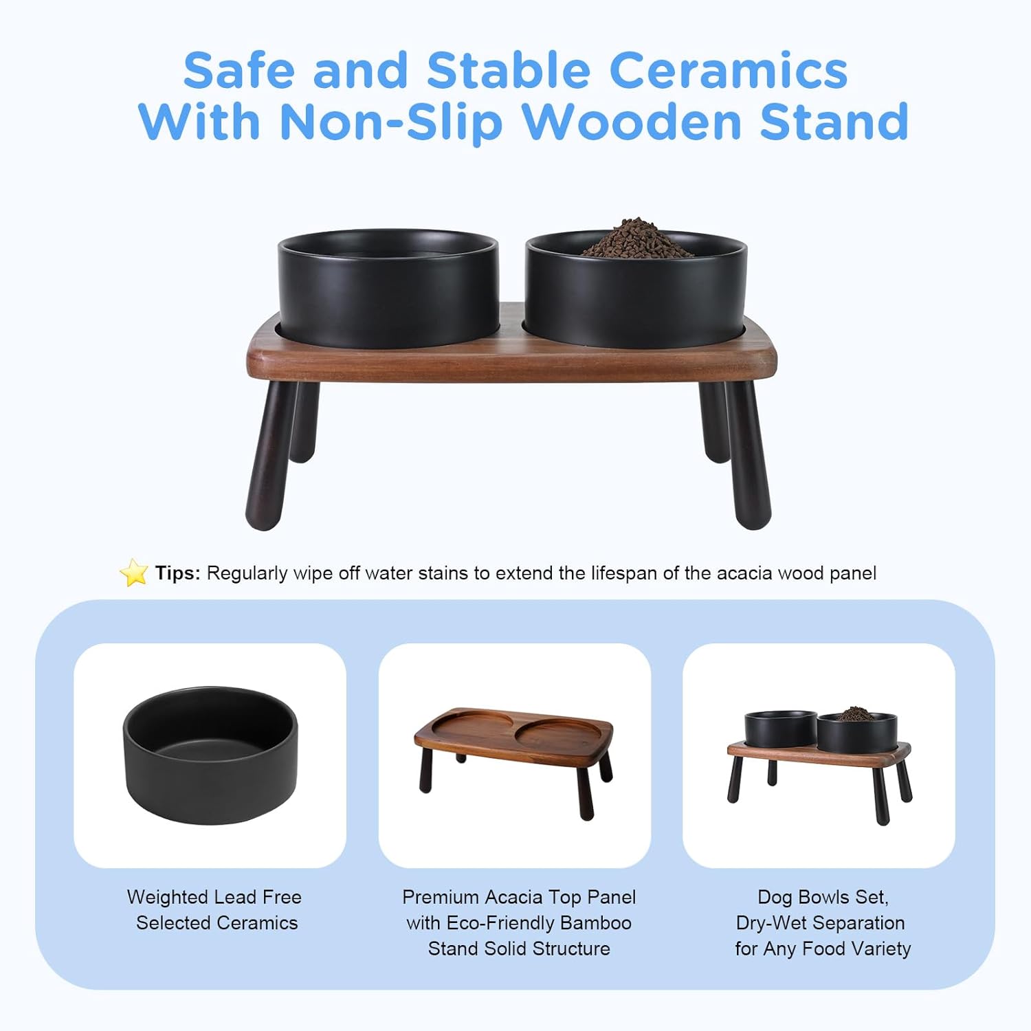 - Modern Design Meets Everyday Convenience – A aesthetic fusion of high quality ceramic and durable acacia wood and eco bamboo creates the elevated dog bowls that blends effortlessly with any home decor. Multiple colors and two different functional sets avaliable to fit the different home decor and pet's needs,The bowl tolerates microwave reheats for warm meals and slides straight into the dishwasher for easy clean, while the durable stand wipes clean in seconds—ideal for any busy pet parents