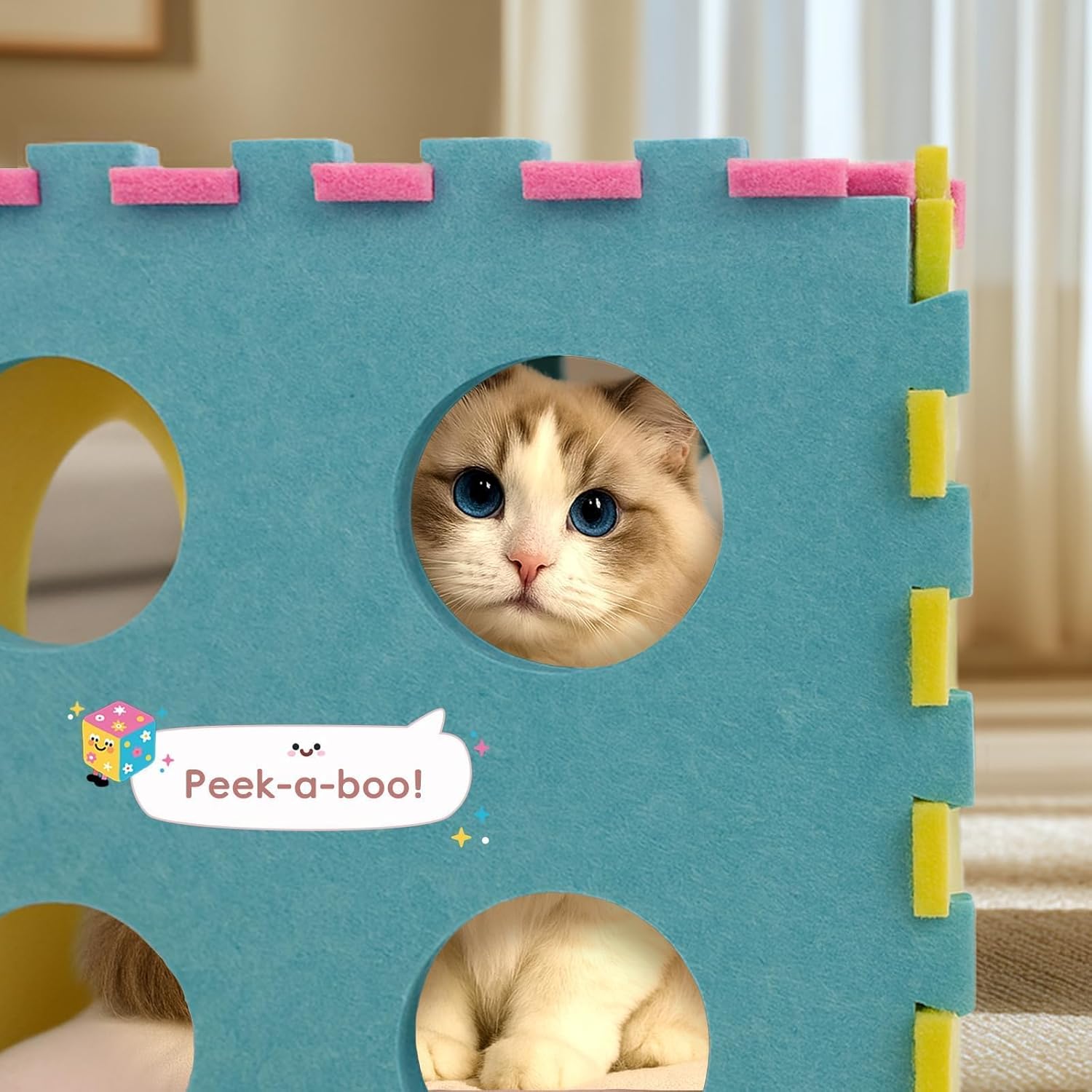 • Which cat wouldn’t love a unique bed? Our colorful cat house features a unique dice shape, making it the perfect addition to any room. Your fur baby can crawl inside and enjoy their own secret hideaway. When they peeks out from one of the openings, it’s sure to become a social media star. Plus, this product can be used as a comfy bed or assembled into a fun tunnel, offering your feline friend multiple ways to play.