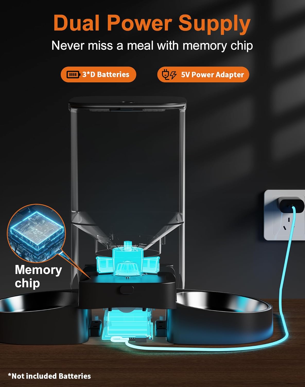 • 【Dual Power Supply】The feeder comes with a Type C adapter and has the option to use 3 D-cell batteries (not included), We recommend using both battery and adapter. The machine needs to be plugged in when used with wifi connection.In the event of a power outage, the automatic dog feeder will continue to run on 3 D-size batteries to ensure your pets never miss a meal.(Note:Cannot connect to wifi when using battery alone)
