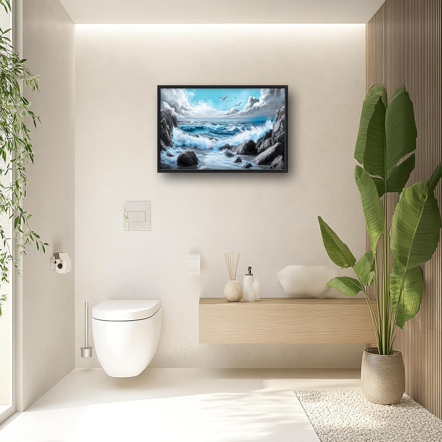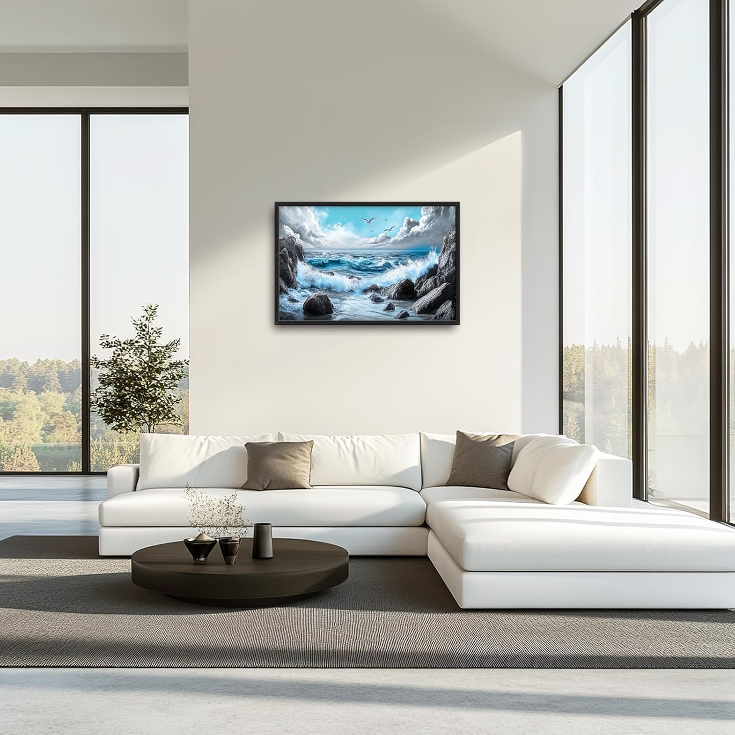 • 【Unique Design】 A stunning ocean scene with crashing waves, rocks, and seagulls in the sky. The blue sea, white clouds, rocks, seashore, sea foam, seashells, waves splashing on the shore, and a blue sky create a breathtaking landscape. The black rocks and stones contrast with the blue waves and water, resulting in a serene and captivating scene.