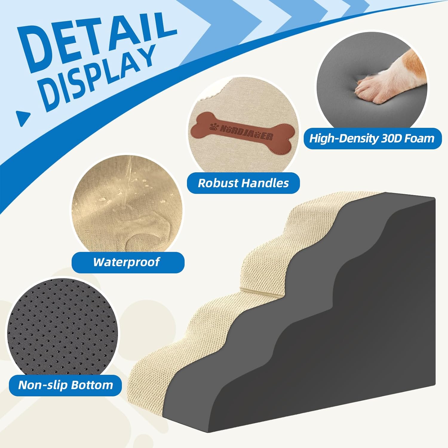 • Stable and Non-slip: The surface of the dog stairs is made of corduroy, and a waterproof layer is designed on the back, so you don't have to worry about the dog urinating; The side is made of wear-resistant linen, so that dogs can sharpen their claws; The bottom is made of anti-slip drop-plastic cloth, which can firmly attach to the ground to ensure the safety of dogs during climbing