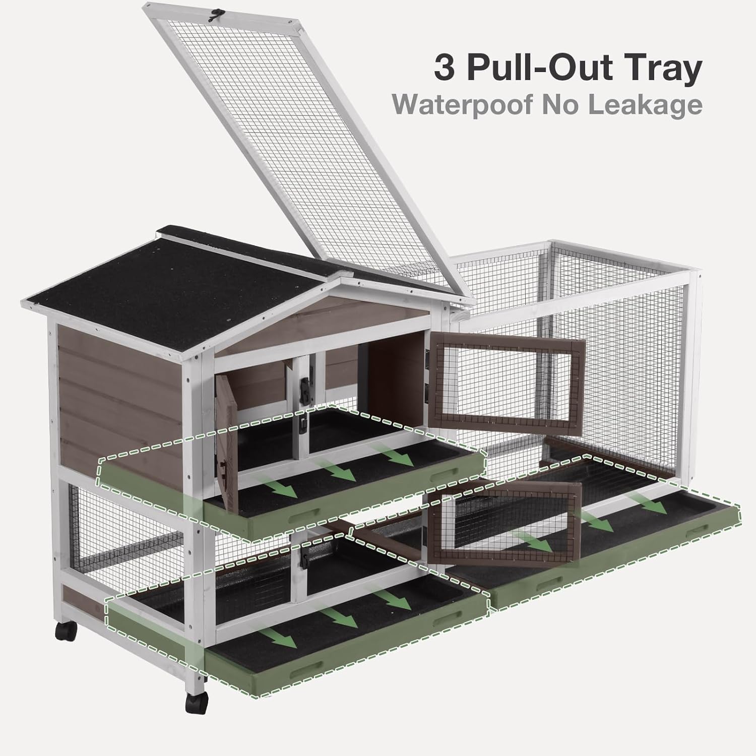 • Easy Cleaning and Maintenance:Designed with convenience in mind, this rabbit hutch features three pull-out trays that are waterproof and leak-proof, making cleaning a breeze. The multiple access points allow for easy cleaning without disturbing your pets