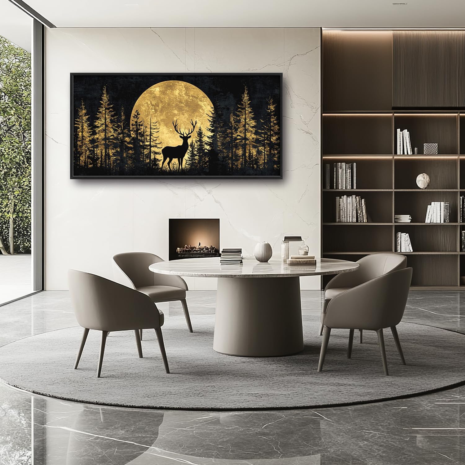 Large Moon Deer Forest Wall Art for Living Room, Black Gold Canvas Oversized Wall Decor, Elk Animal Framed Pictures Painting Print Artwork for Bedroom Office 60L" x 30W"