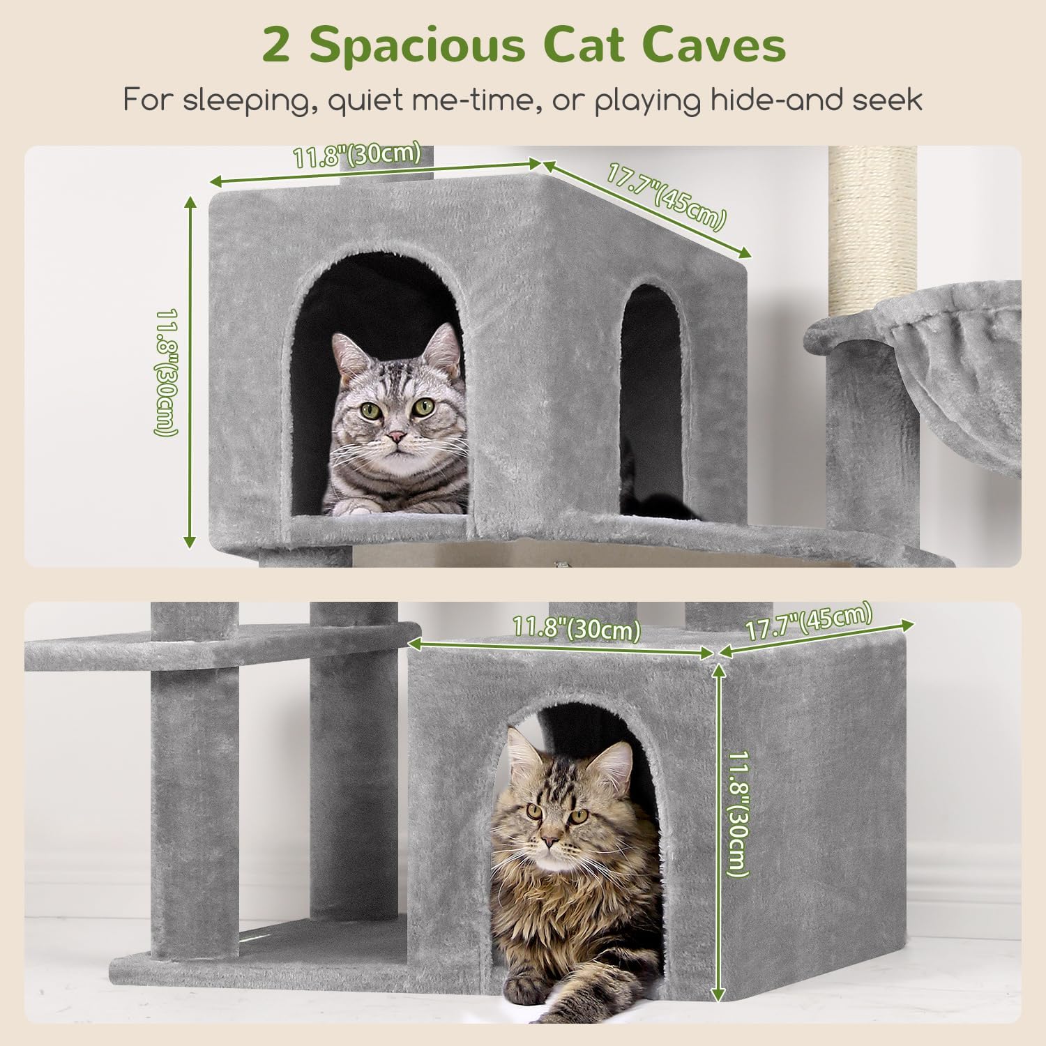 • 2 Spacious Cat Condos: This tall cat tree for indoor cats features 2 roomy cat condos, providing your cats with their own private space. Whether resting or playing, they can find a sense of security here and enjoy their own time