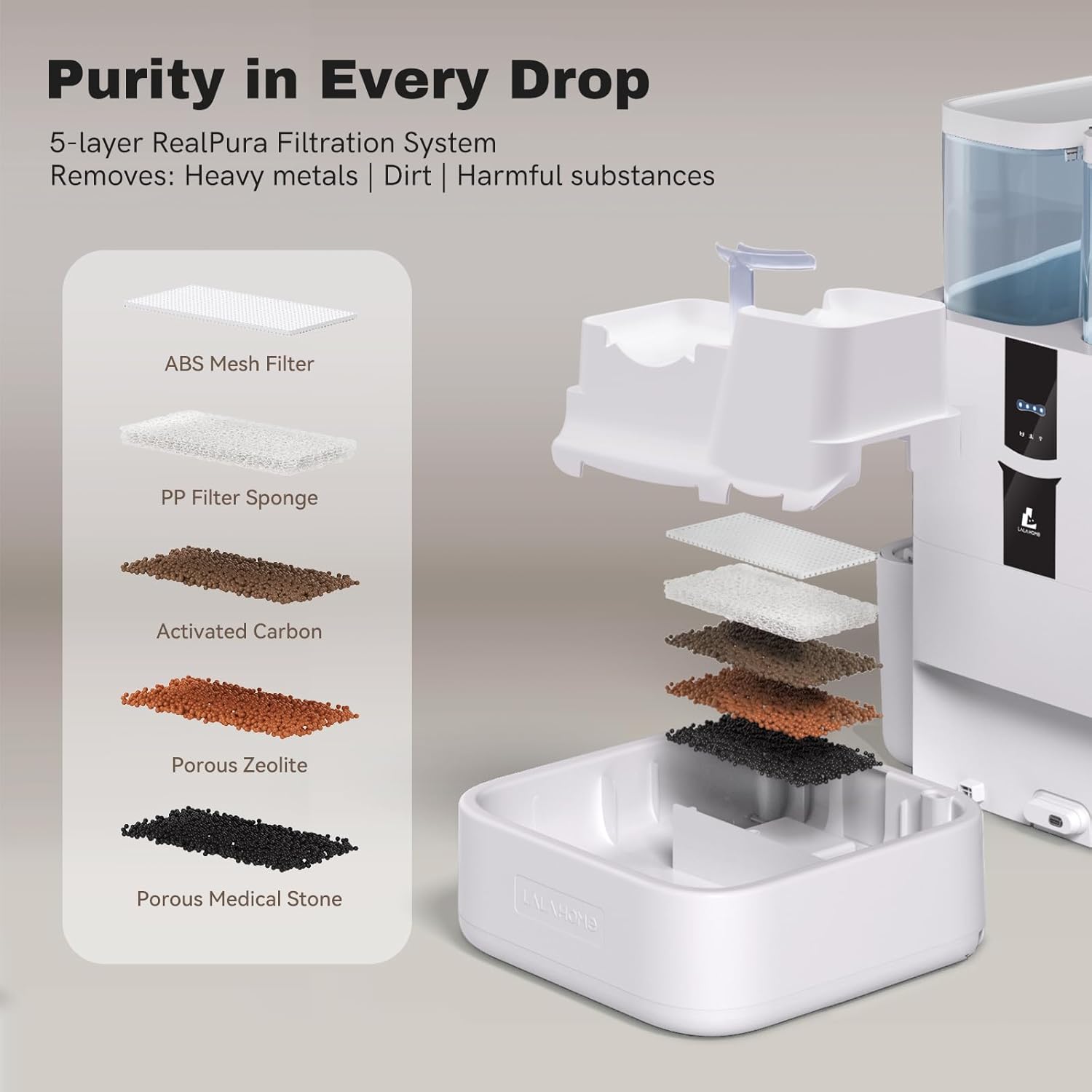 - Oxygen-Rich Water for Healthier, Happier Pets: The DailyFresh RealFountain pet water dispenser features cutting-edge OxygenZ Technology, which infuses every sip with tiny oxygen bubbles to boost water quality and taste. Unlike regular fountains, this oxygen-enriched water makes your cat love drinking more, naturally supporting hydration, energy, and a shinier, healthier coat. Give your pet the kind of water that does more than quench thirst, it promotes overall wellness from the inside out.