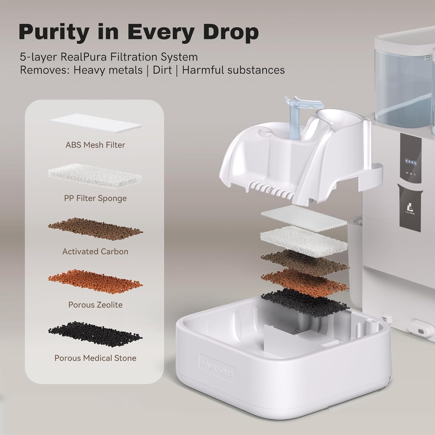 - Cleaner Water with the Unique 5-Stage Filtration: LALAHOME cat drinking fountain stands out with 5-stage filtration system: Water gets pre-filtered through a mesh screen, trapping hair and gunk in a sponge filter. Then itโs pushed through activated carbon, zeolite, and finally cleaned by the maifan stone. It can effectively filter and diminish the hair, impurity, odor, and chlorine. The filtered water dispenser can give cleaner water to pets and reduce the risk of developing illness.