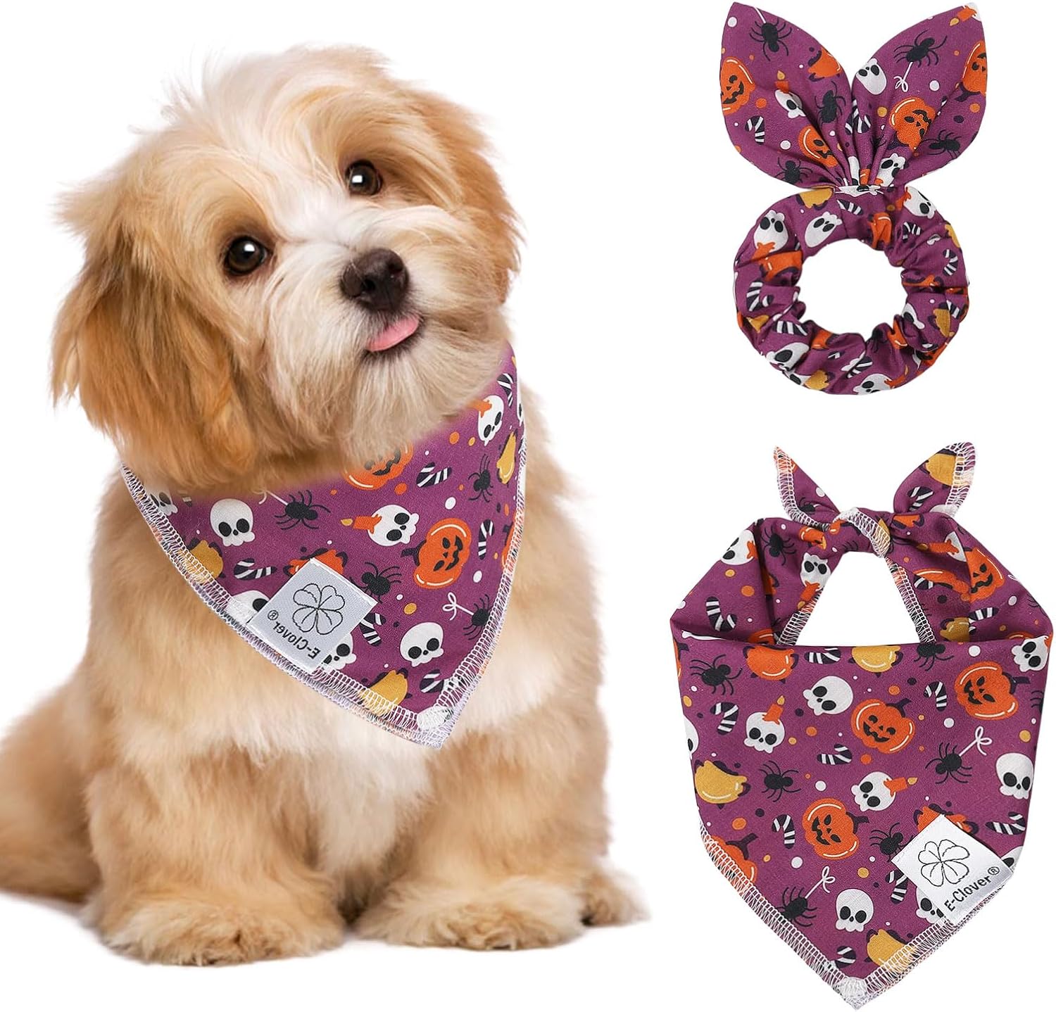 E-Clover Halloween Dog Bandanas & Matching Scrunchie Set Girl Cute Pumpkin Dog Scarf Bibs Pet Bandana with Bow Tie for Small Dogs Puppy Owner Mom Purple Orange