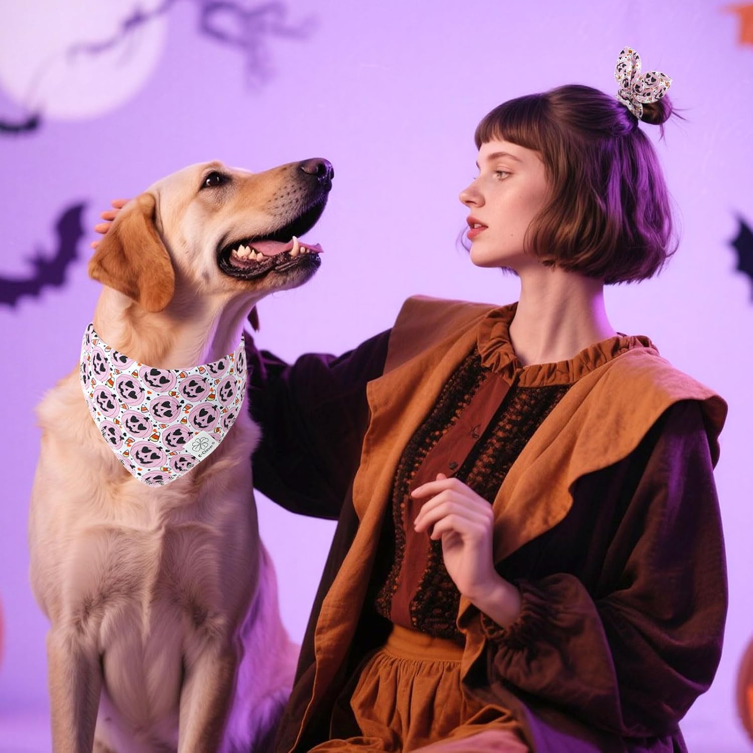 • Matching Bandana and Scrunchie Set: When your pet is wearing a pink handkerchief and you are wearing a bow headband, it's very fun for you to cause trouble and ask for candy together on Halloween! When traveling, sleeping, taking photos or daily warking, adorable fall dog bandana and scrunchie is a pretty accessories.The the hair tie can be worn as a wrist accessory and hold your hair.