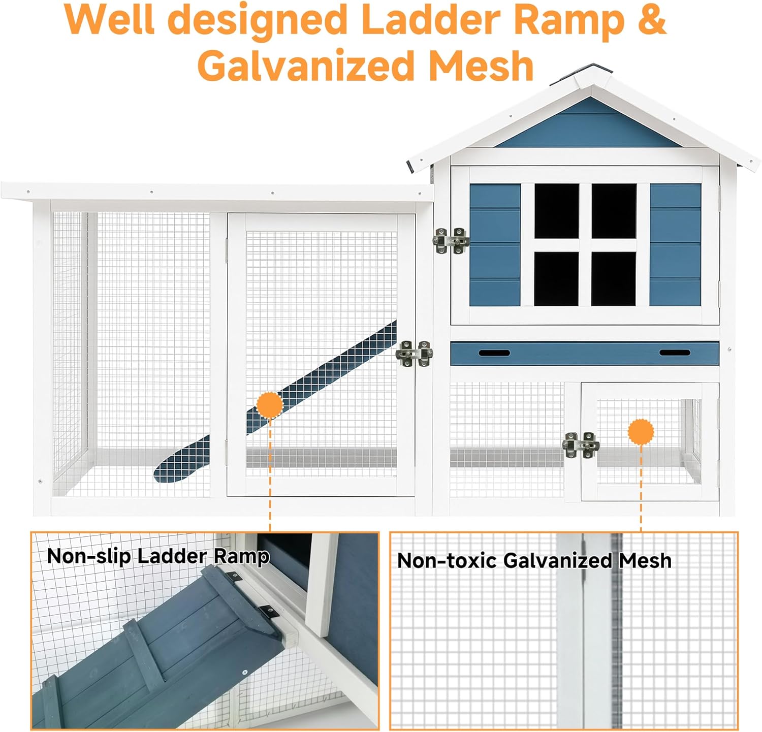 • Dual-Living Indoor/Outdoor Haven, Perfect as a chic indoor bunny condo or a backyard chicken coop! The widened anti-slip ramp, 2-story design, and 4 access doors (front/side/roof/ramp) let pets climb, play, and rest, while you bond through multiple interaction points. Fits apartments and gardens alike