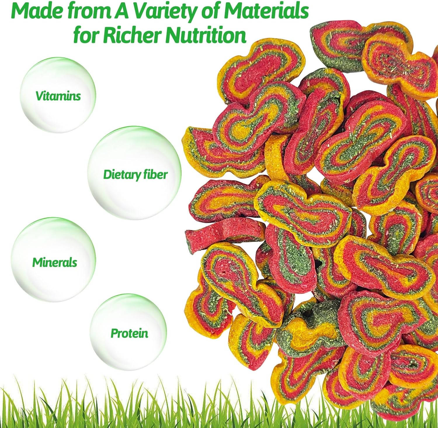 • Natural Green Materials: Rabbit chews are made from natural plant powders, including forage, sugar beet, pumpkin, and carrot, which are baked at high temperatures to preserve their natural flavor, making them safe for small animals to eat