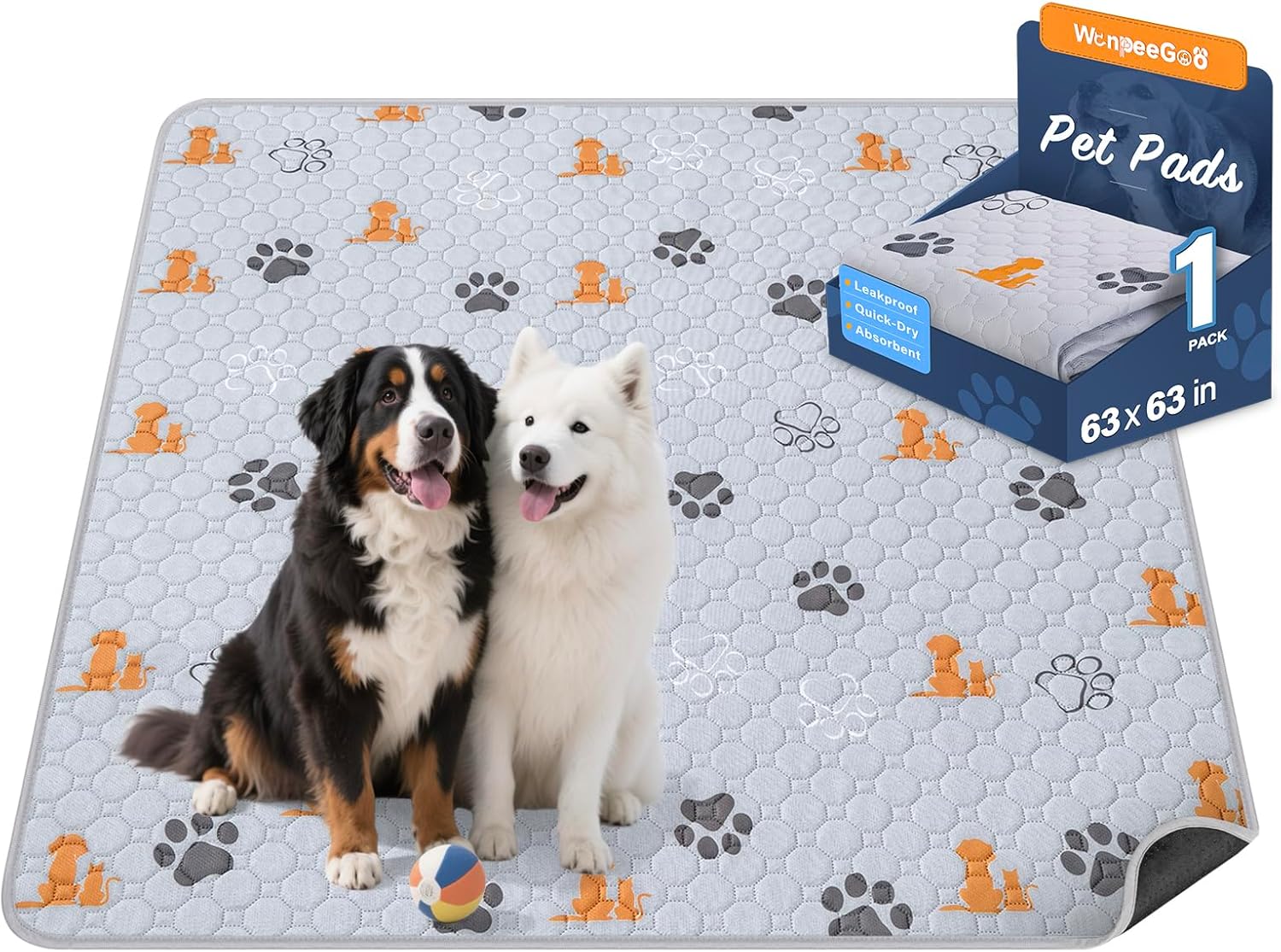 • 【Cute Dog Pee Pads】Come with 1 Packs. 63"x63" size with cute pattern are available to accommodate all dog breeds.Washable dog pee pads with our stylish design can be a puppy training pad, dog pen mat, dog playpen mat, dog carpet waterproof, crate pad, waterproof floor mat, pet piddle pad, dog kennel pad.