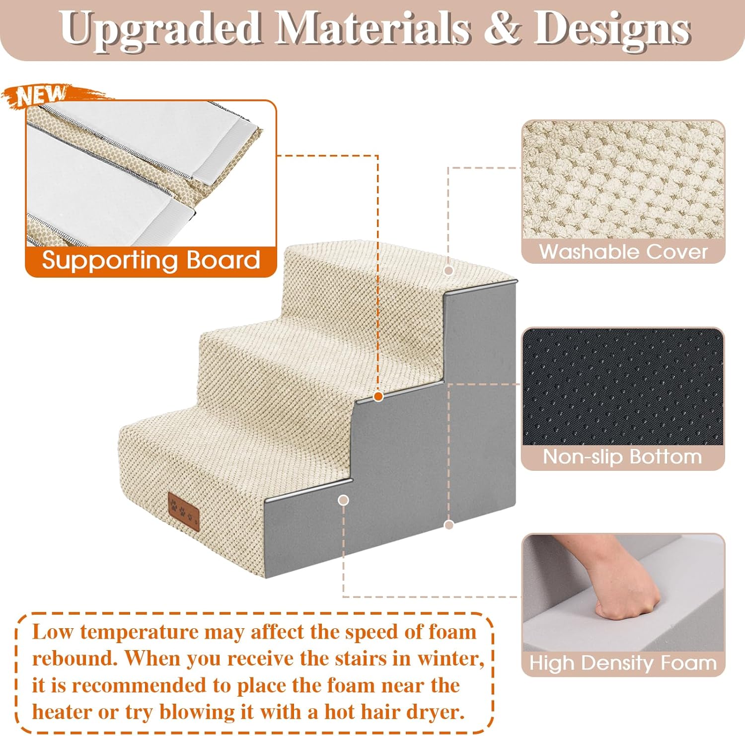 • 【ENHANCED STABILITY】 GGIB dog stairs improve a new design with supporting boards, added between the foam stairs and the removable cover. They are fixed inside the cover. Dogs can step on more stable and supportive stairs surface, preventing them from slipping when moving quickly.