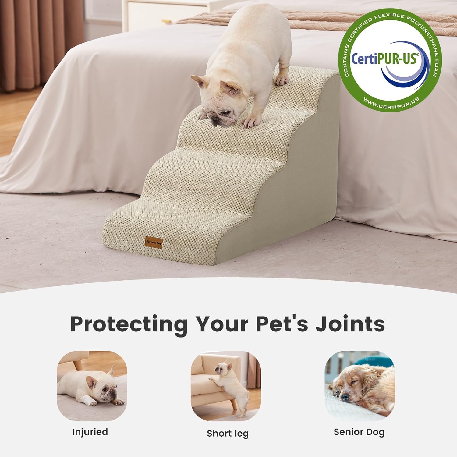 Gardner Pet Dog Stairs for Small Dogs 19.7" H, 4-Step Beige Curved Pet Stairs, Dog Steps for High Bed (18-24 in), Couch with Durable Non-Slip Waterproof Fabric Cover and CertiPUR-US Certified Foam