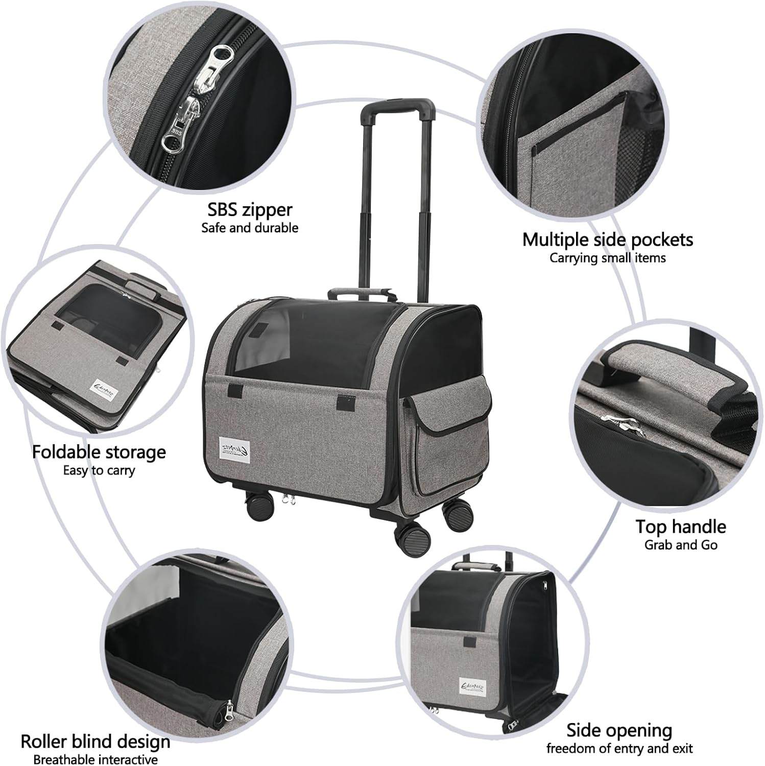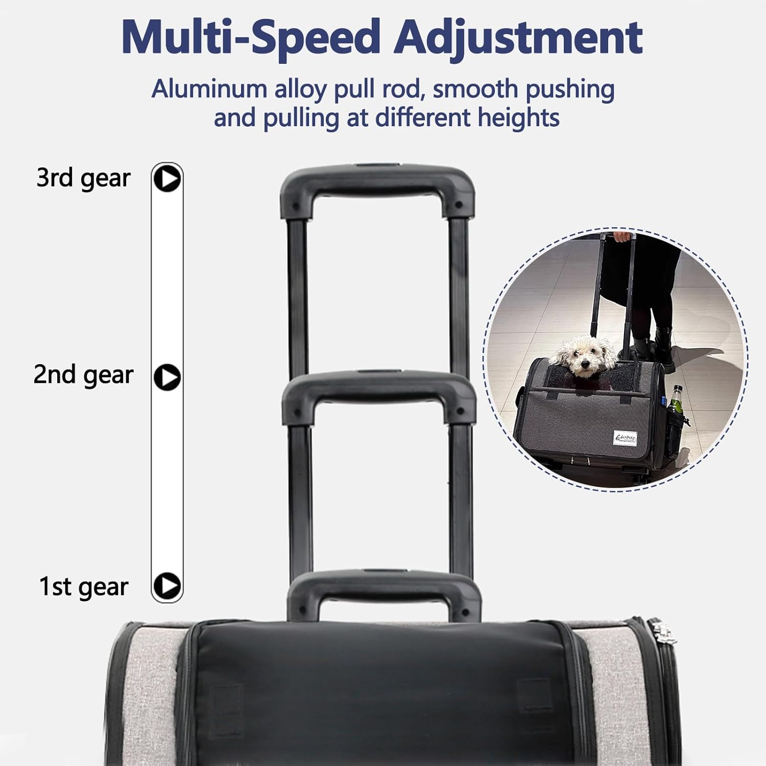 • Two ways to carry: Our pet bag allows you to easily unload the burden on your shoulders! This pet bag is equipped with 4 high-quality rollers that can rotate 360°, which can bring a smooth and comfortable experience even on rugged roads or grass. The top handle is convenient for hand-carrying, and two ways of carrying make travel more convenient.