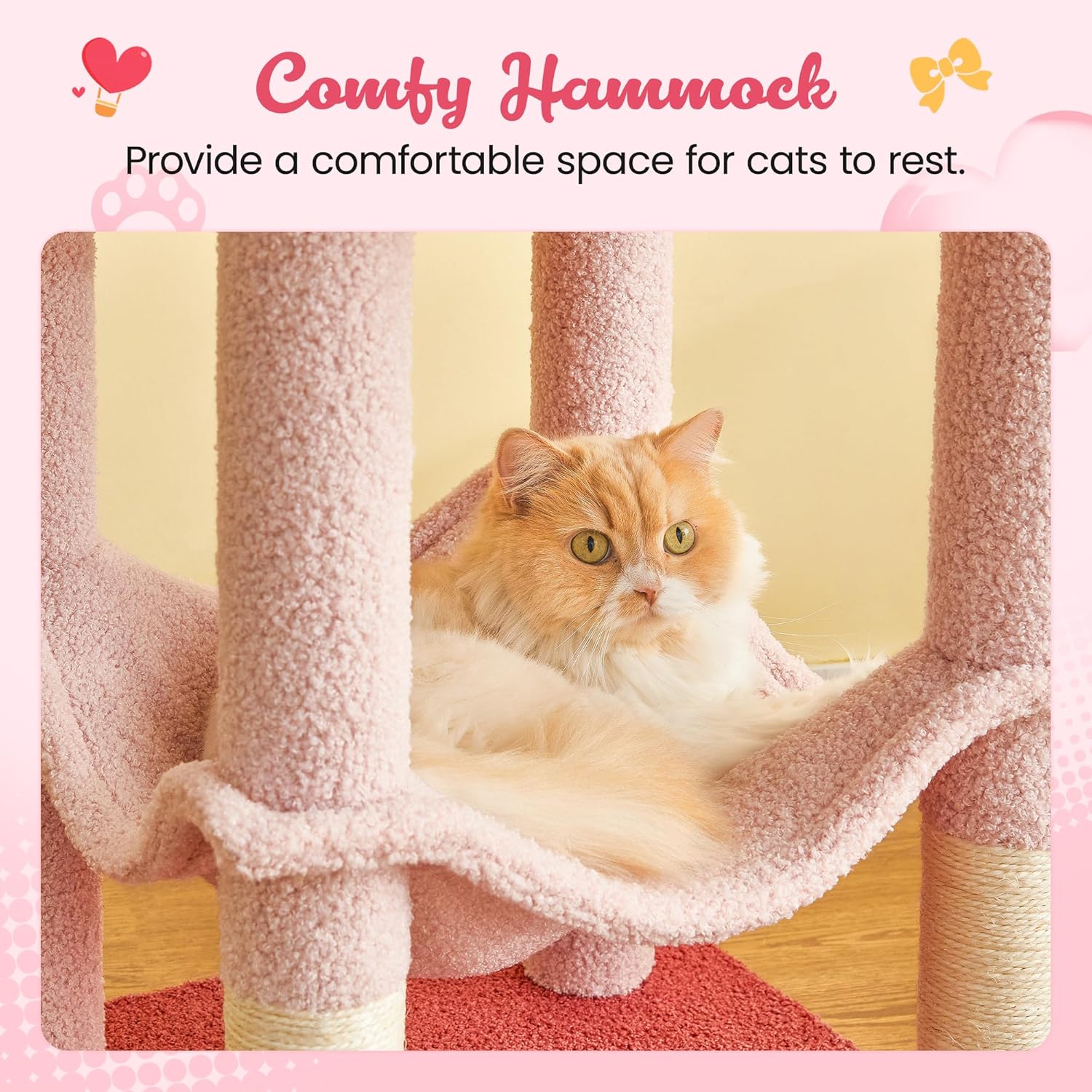 MWPO Cute Cat Tree, 63.8-Inch Pink Cat Tower for Indoor Cats, Multi-Level Cat Condo with 5 Scratching Posts, 2 Perches, Hammock, Dangling Toys