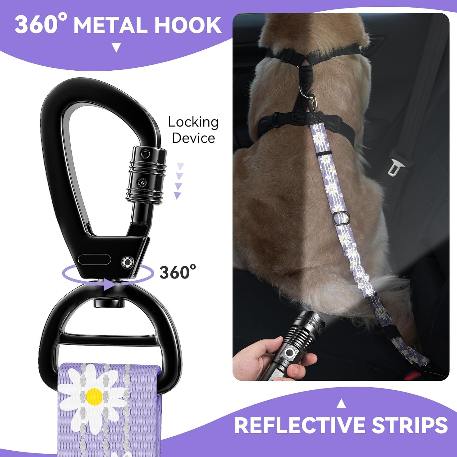• 360° Lockable Safety Buckle: The buckle of the dog seatbelt for vehicle is designed with locking structure to prevent accidentally opened during use, so you can drive with peace of mind. 360° free rotation prevents leash tangling and knotting, allowing dog to move more freely.