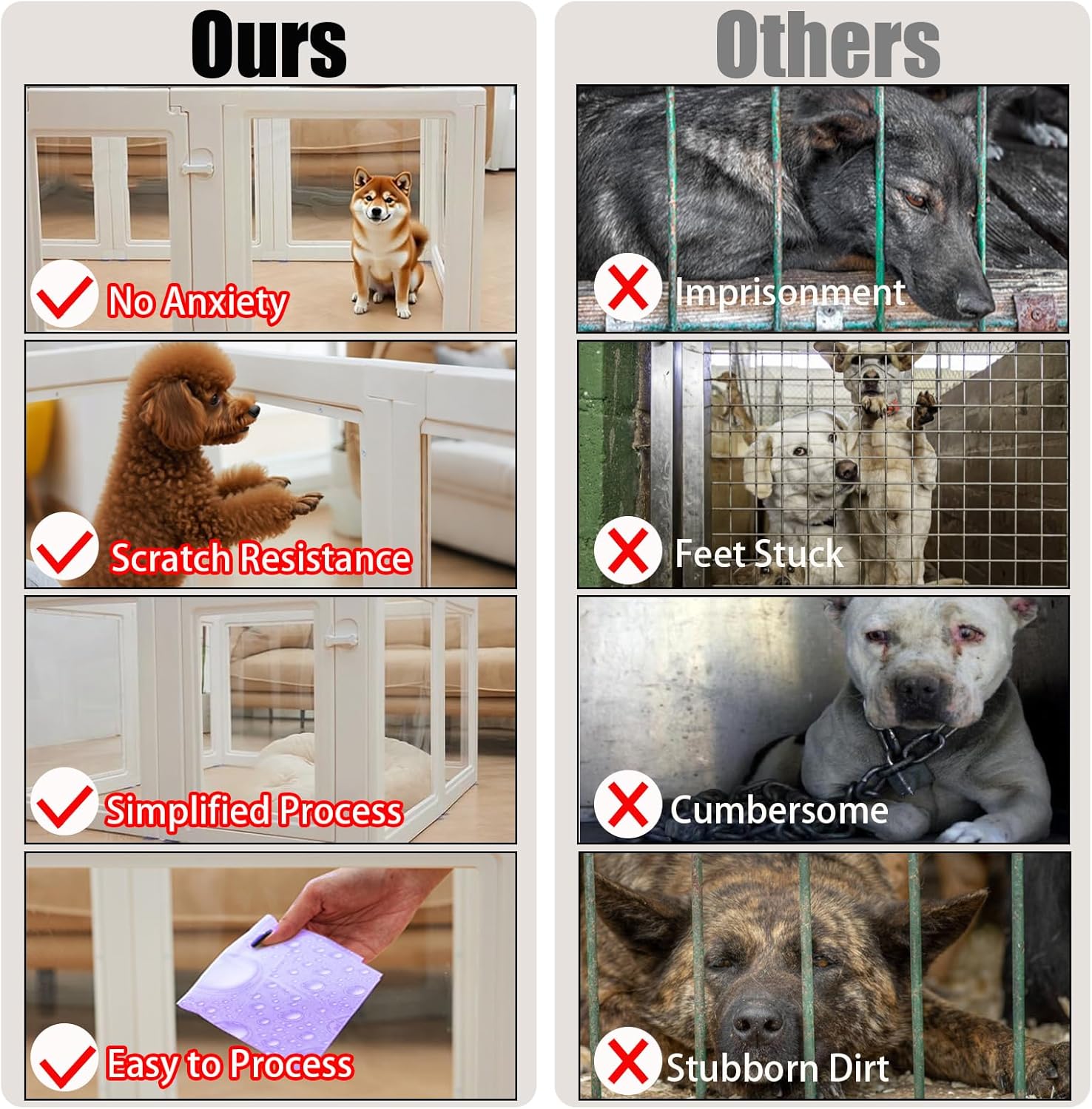 • 【Durable Materials】This dog playpen is made of high quality acrylic and polyethylene material, which is very wear-resistant and durable. 2 cm thick panels prevent pets from scratching and gnawing . The clear acrylic panels allow pets to see their owners without anxiety