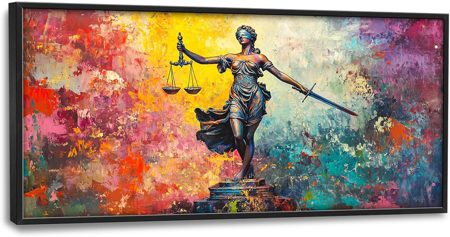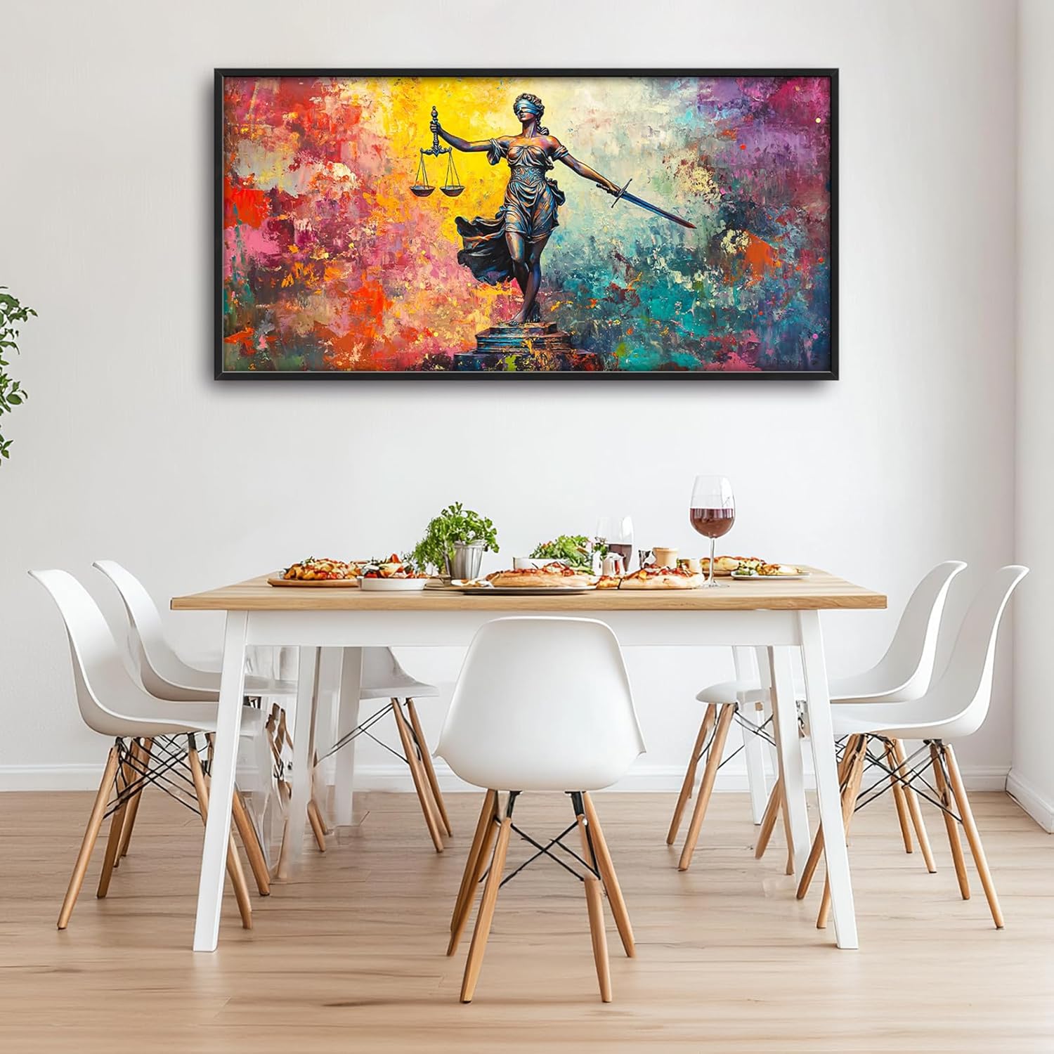 • 【Unique Design】 The painting depicts the Statue of Lady Justice holding a sword and scales in front, with bright, vibrant colors in an oil-on-canvas composition and a colorful background.